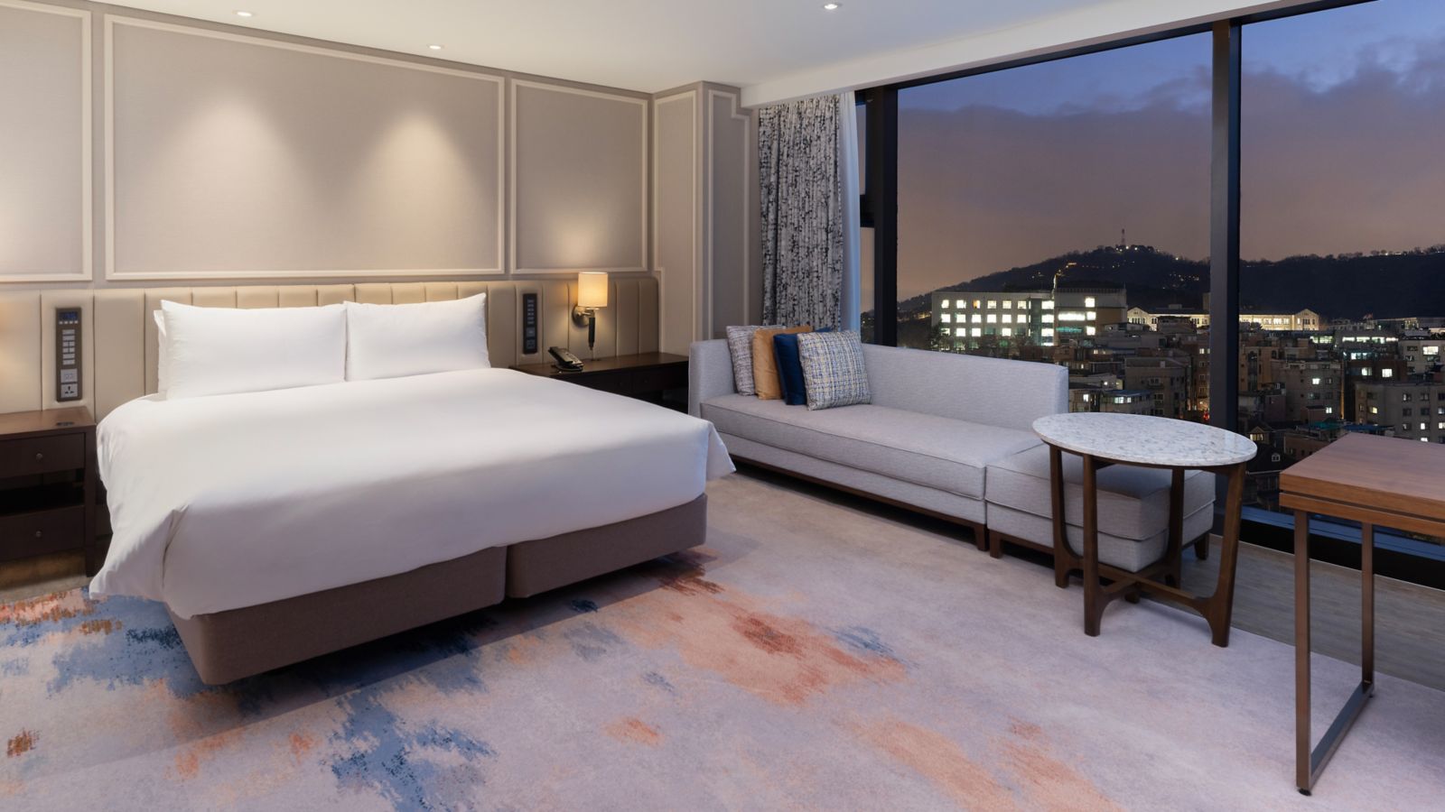 Size of 40m² Room with 1 King bed. Features skyline of Seoul as located on high floor. 65' Smart TV, Coffee Machine, Wireless Charger, Bluetooth Speaker, Bathtub. Complimentary access to Sauna, Club Ambassador Lounge (Lounge breakfast).