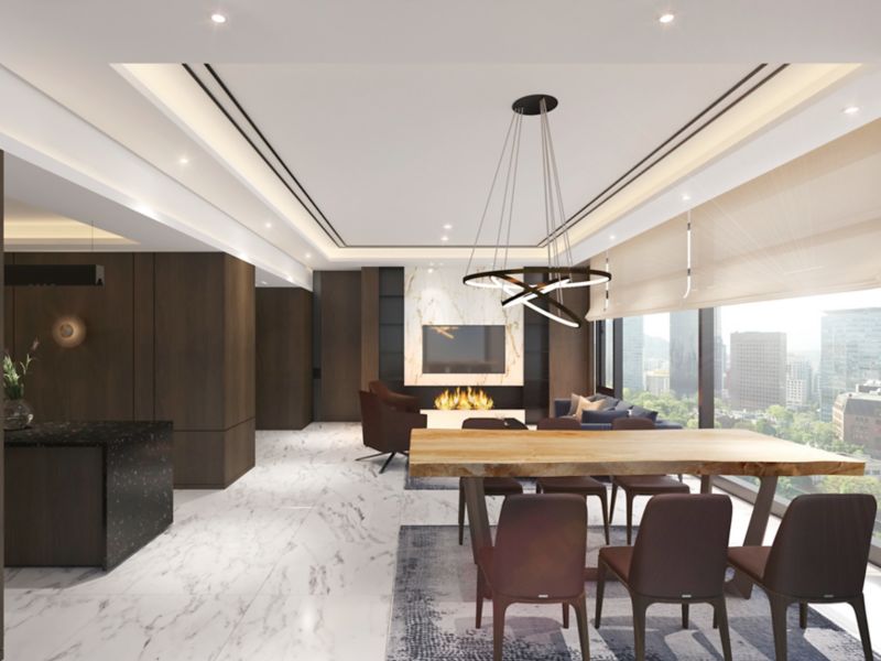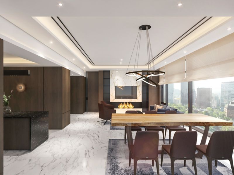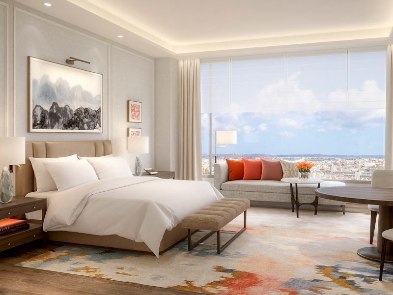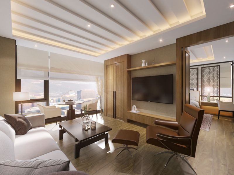 Size of 131m² Suite with 1 King bed offers panoramic view. Separated living room, work space, and kitchen. 65' Smart TV, IoT Service, Bathtub with Penhaligon's bath amenities. Complimentary access to Sauna, Club Ambassador Lounge.