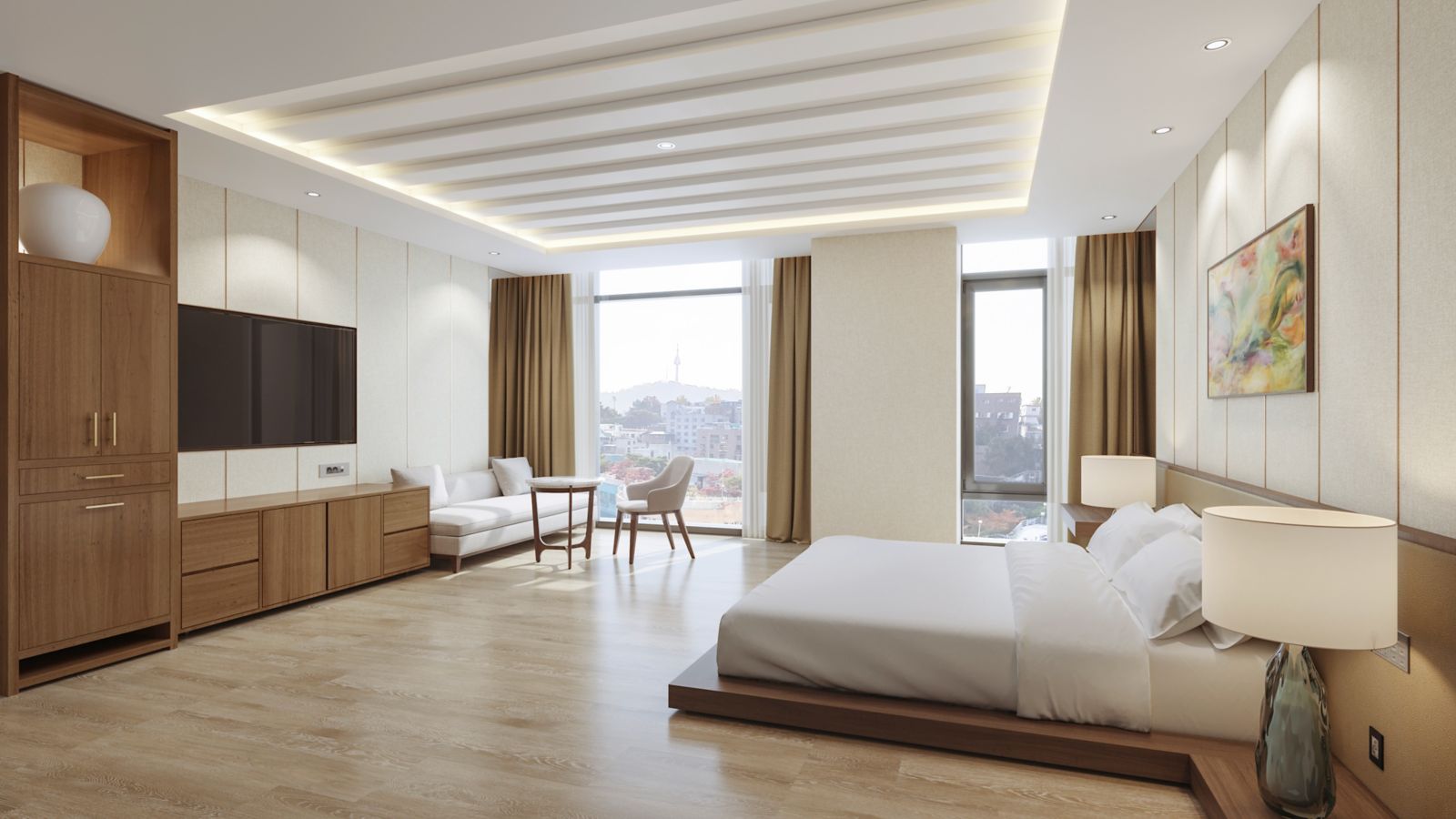Size of 42m² Room with 1 King bed. Korean traditional heating system on the floor. 65' Smart TV, IoT Service, Coffee Machine, Wireless Charger, Bluetooth Speaker, Bathtub, Rain Shower and Complimentary Mini Bar.