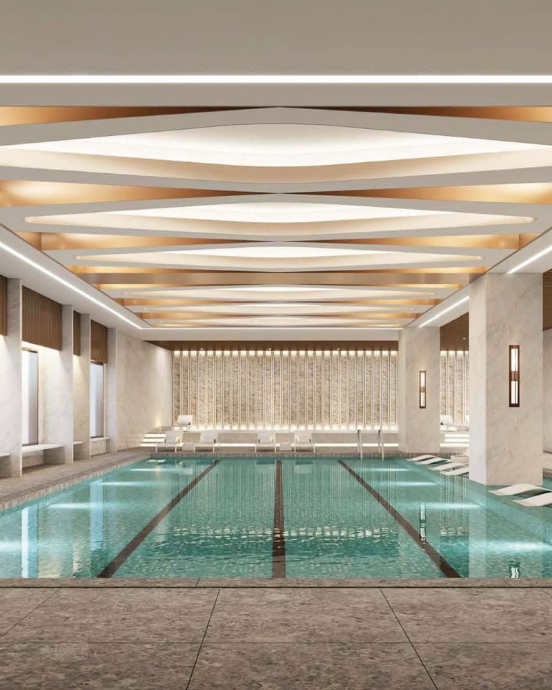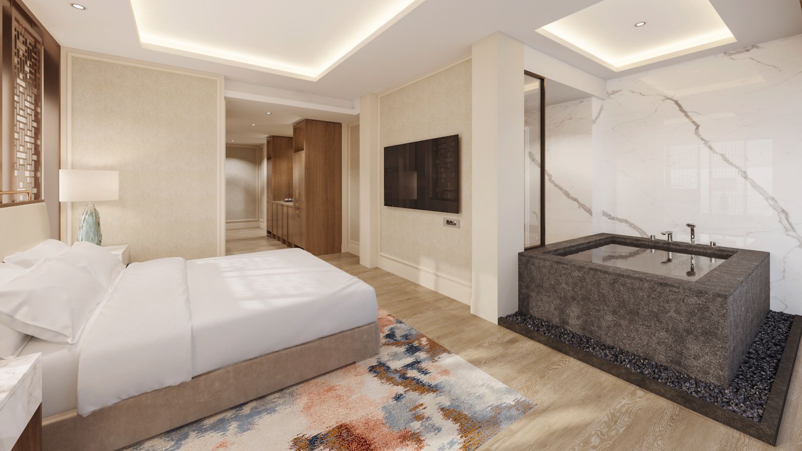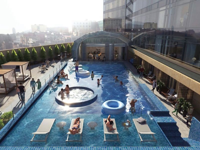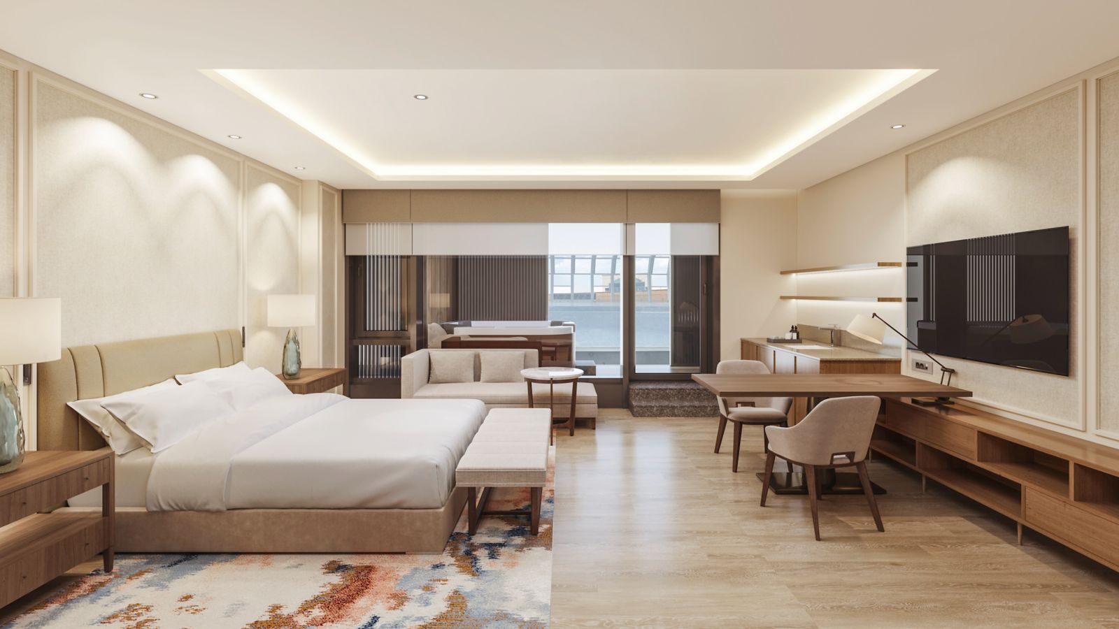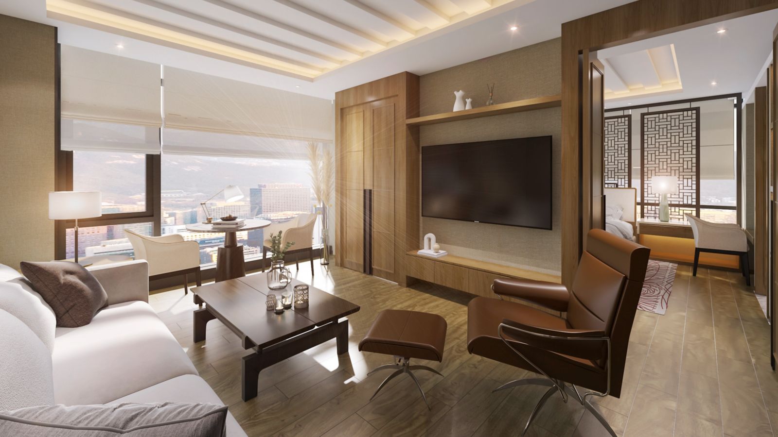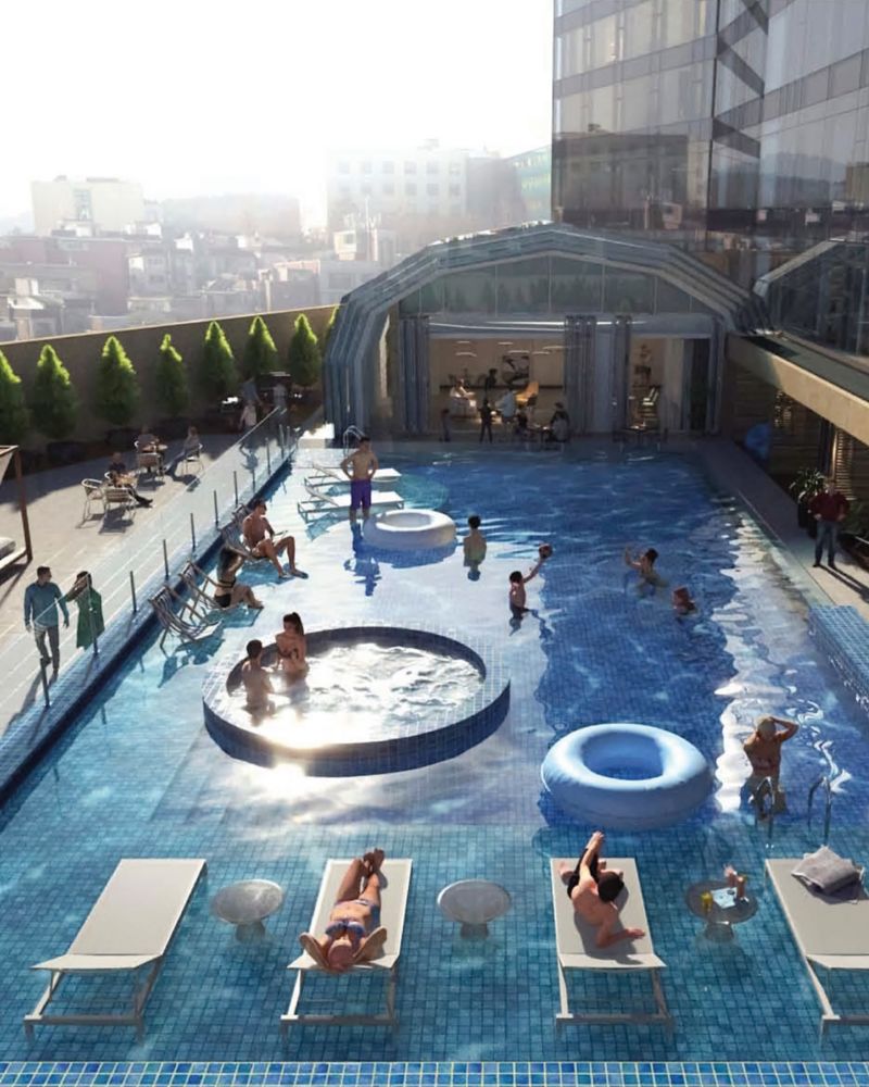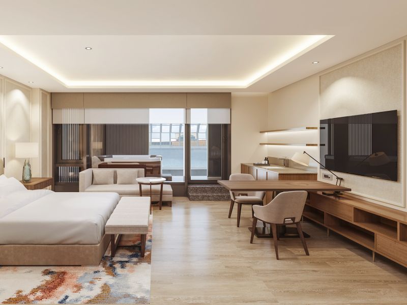 A 50㎡ suite with 1 king bed, directly connected to the outdoor pool, Includes a jacuzzi, bathtub, 65-inch smart TV, IoT services, and wireless charging.Complimentary access to the sauna and Club Ambassador Lounge, with lounge breakfast.