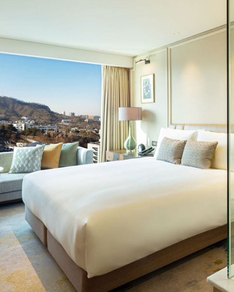 Size of 42m² Room with 1 King bed. Korean traditional heating system on the floor. 65' Smart TV, IoT Service, Coffee Machine, Wireless Charger, Bluetooth Speaker, Bathtub, Rain Shower and Complimentary Mini Bar.