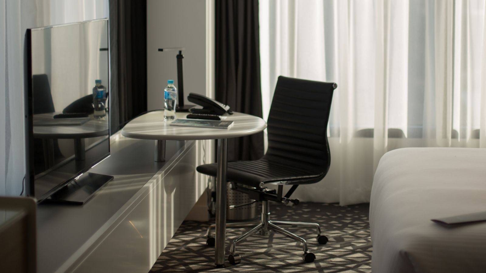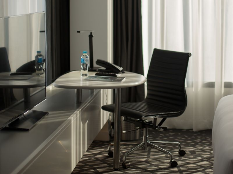 31 SQM / 333 SQF Room, Open contemporary design, floor to ceiling double glazed window, 48inch Smart TV, Accessible shower with pull-around curtain and fold-down seat, contoured lounge chair with ottoman, work desk, docking station, chargeable Internet an