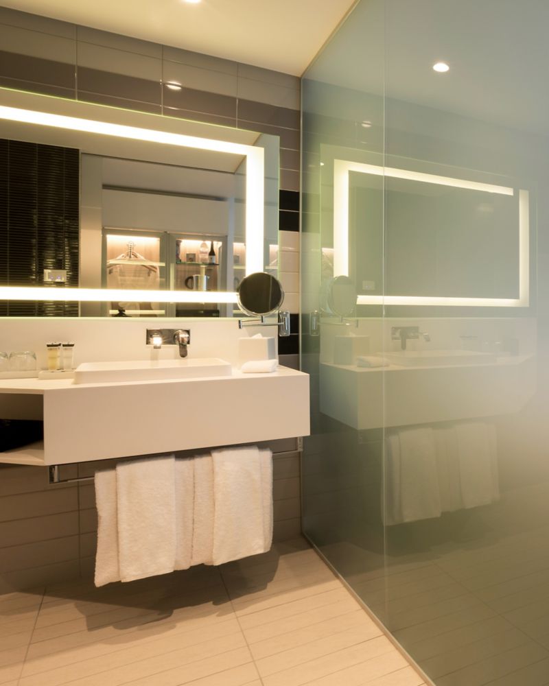 31 SQM / 333 SQF Room, Open contemporary design, floor to ceiling double glazed window, 48inch Smart TV, Accessible shower with pull-around curtain and fold-down seat, contoured lounge chair with ottoman, work desk, docking station, chargeable Internet an