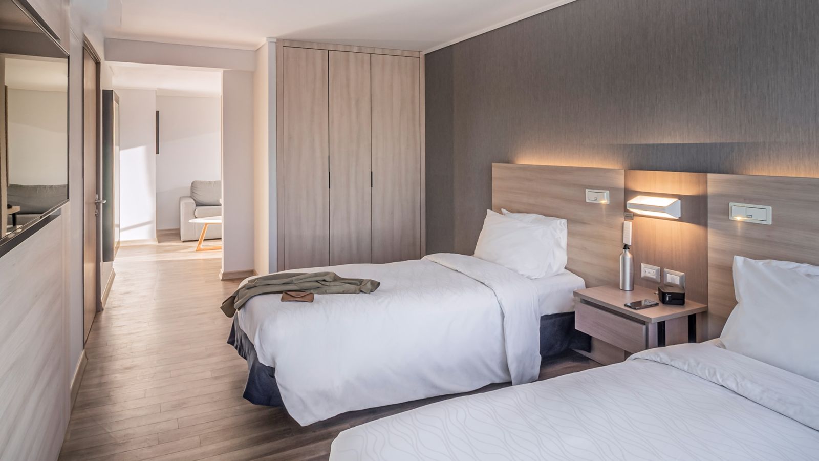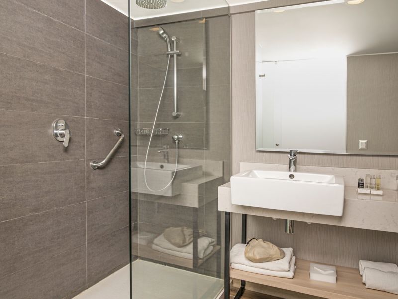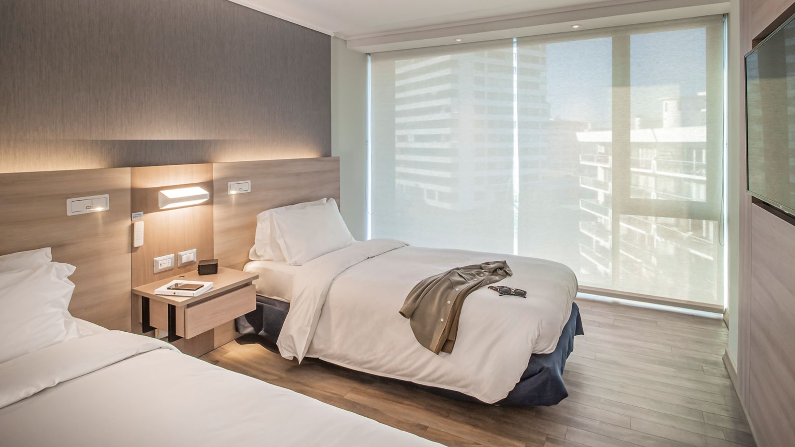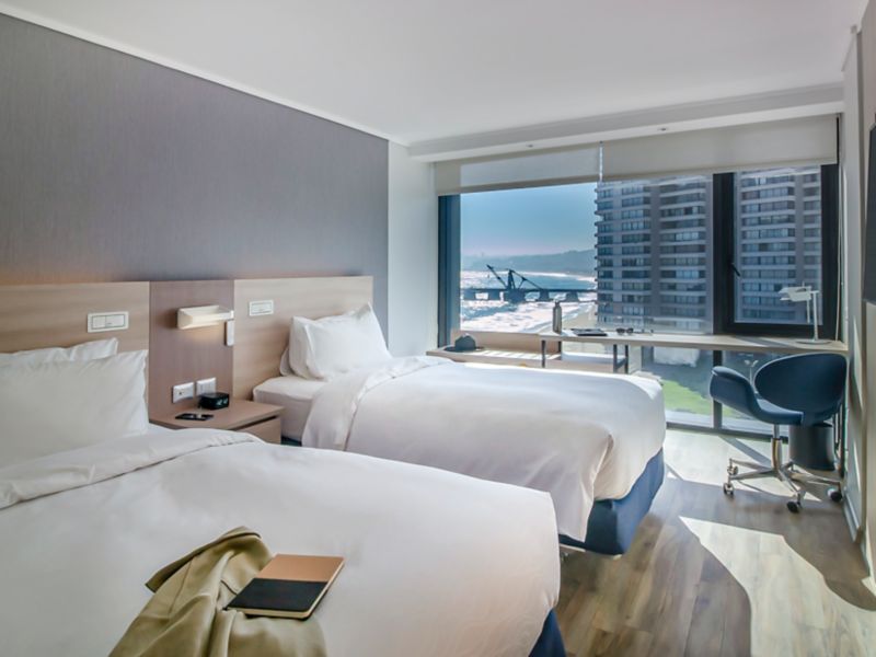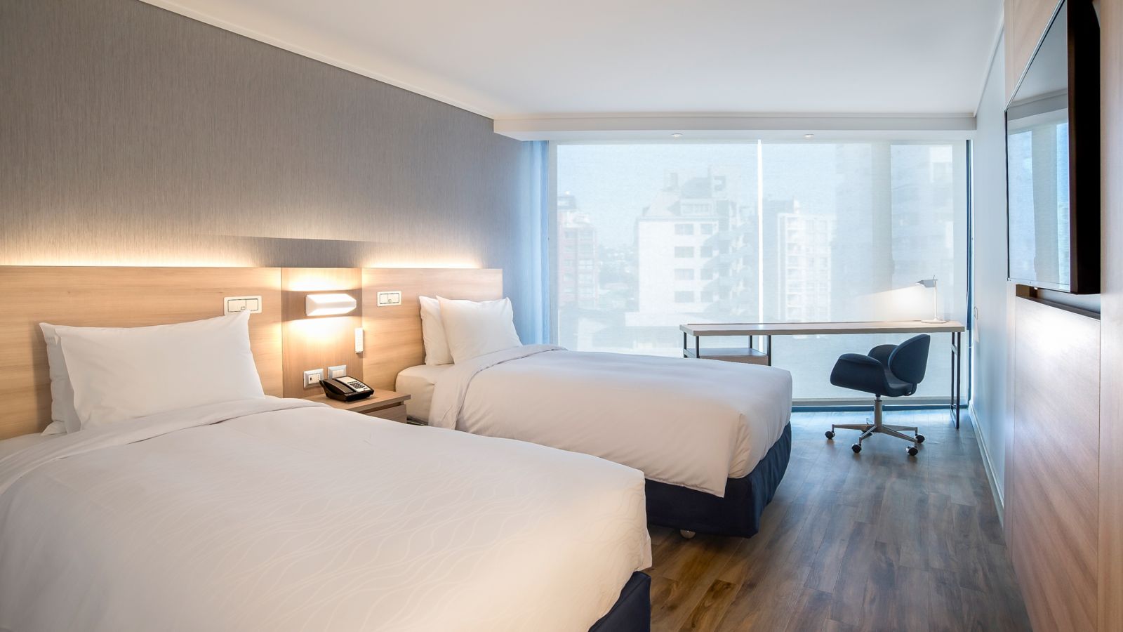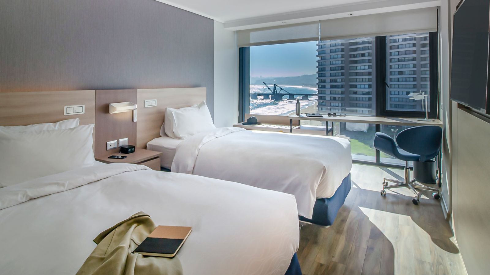 Accessible, modern room located on a high floor, 247 ft², with 2 single size beds, 40" LCD with Netflix and Beyond TV, air conditioning, WIFI, and a work area.