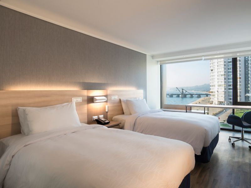 Located on penthouse floor. Cozy & modern 23 m² rooms with 2 single beds & beautiful view of bay. Features 40" LCD, Netflix & Beyond TV entertainment system. Air conditioning, WiFi & work area