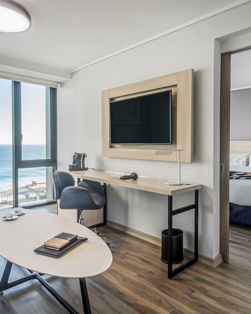 At 47 m², our exclusive suite is the hotel's largest and offers everything you need to enjoy Viña del Mar. It has a living area, TV with Netflix and Beyond TV, slippers in the bathroom and coffee maker.