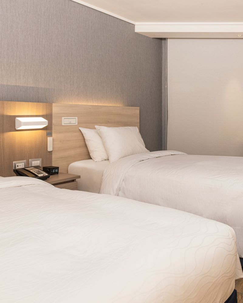 Ideal for one or two, our superior room has 23 m² of comfort and practicality. Rooms overlook the city and have two double beds, TV with Netflix, Beyond TV and large windows, favoring natural light.