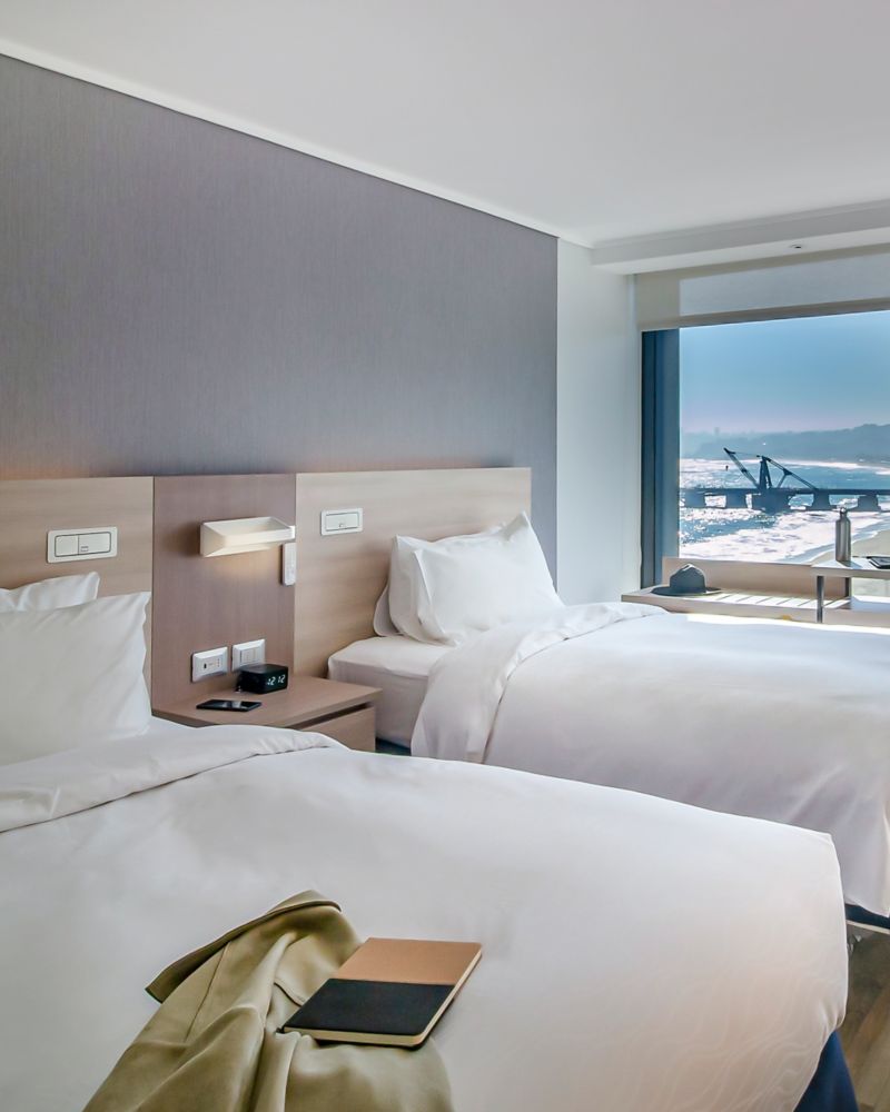 The Twin Deluxe room on the top floor offers a serene retreat with two single beds and a breathtaking sea view. Immerse yourself in a space where creativity meets tranquillity, allowing for moments of rest and comfort. Enjoy the thoughtful amenities and intuitive technologies that make every stay a refreshing haven.