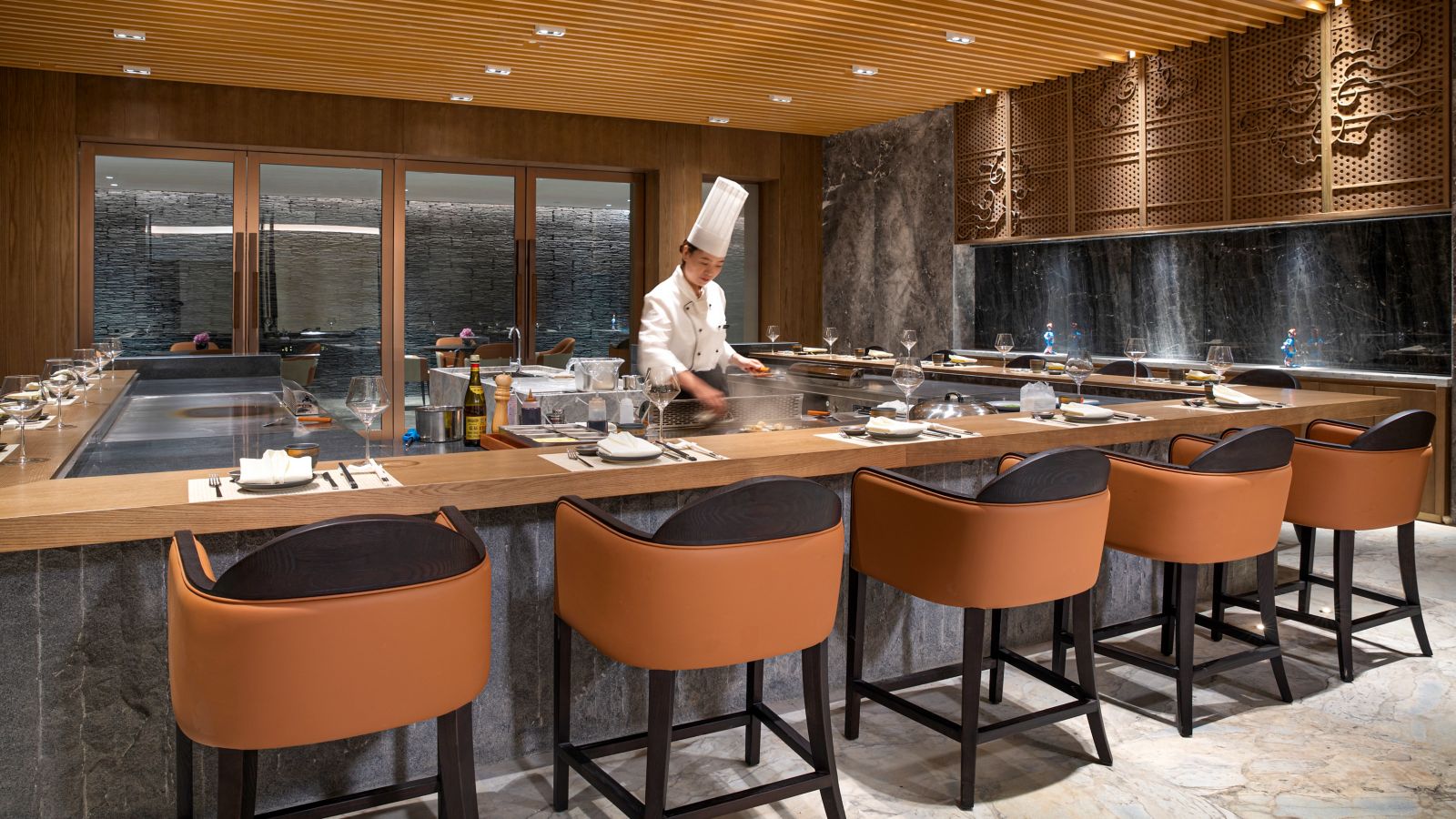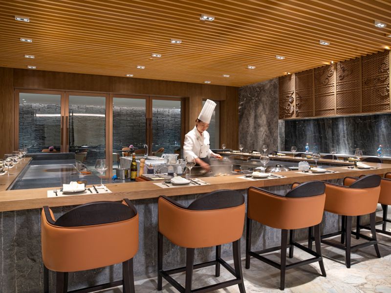 这家开放式日式铁板烧酒吧位于地下室中,可容纳 15 位客人在此从视觉和味觉上领略精致的日式美食。