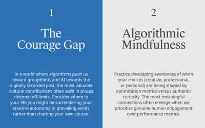 - 1. The Courage Gap: In a world where algorithms push us toward group think, and AI towards the digitally recorded past, the most valuable cultural contributions often exist in places deemed off-limits. Consider where in your life you might be surrendering your creative autonomy to prevailing winds rather than charting your own course.
