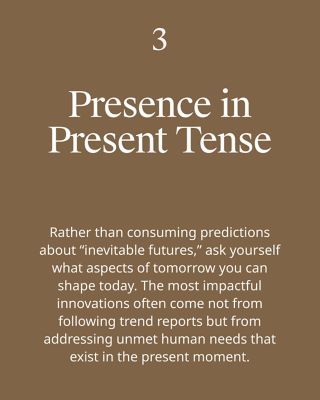 - 3. Present-Tense Agency: Rather than consuming predictions about “inevitable futures,” ask yourself what aspects of tomorrow you can shape today. The most impactful innovations often come not from following trend reports but from addressing unmet human needs that exist in the present moment.