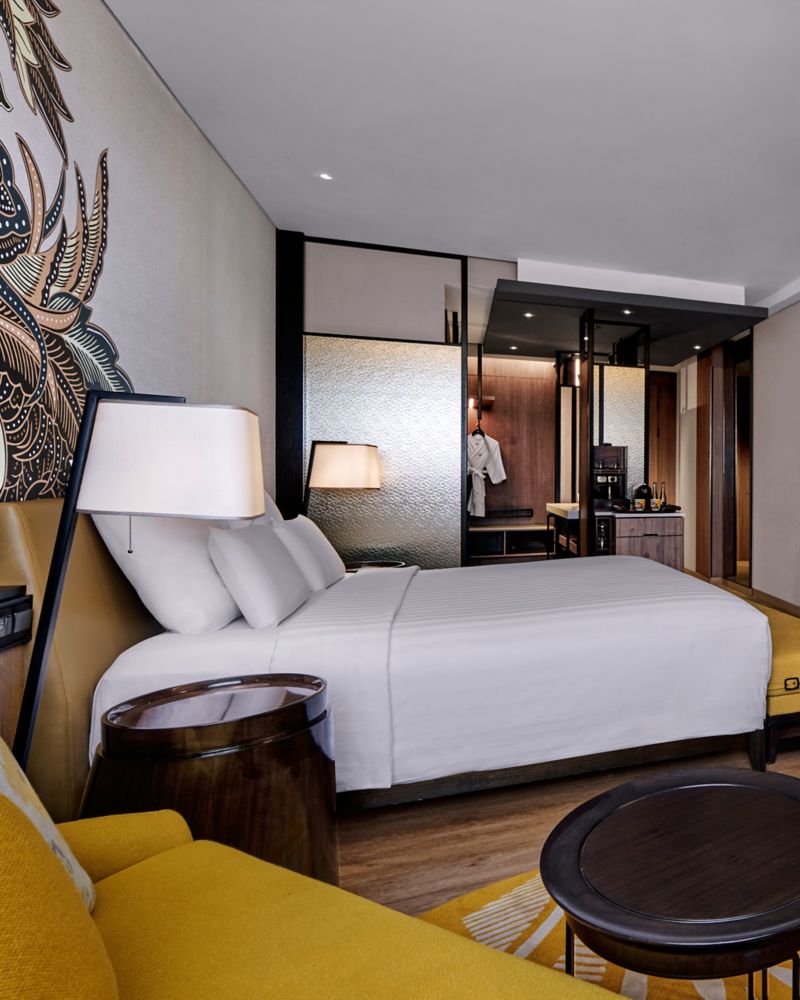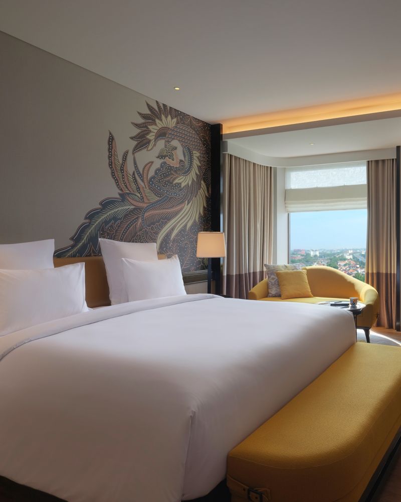 Habitación moderna de 36 m² con vistas panorámicas a la ciudad desde nuestro hotel en Bandung. La habitación cuenta con una cama de marca Pullman, IPTV LED de 55", WIFI gratuito, cafetera espresso y acceso gratuito al gimnasio y la piscina.