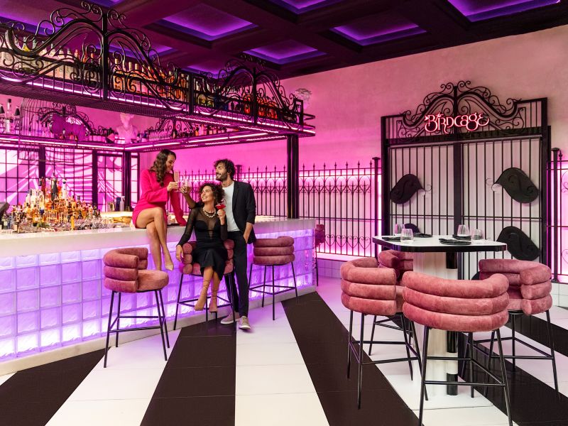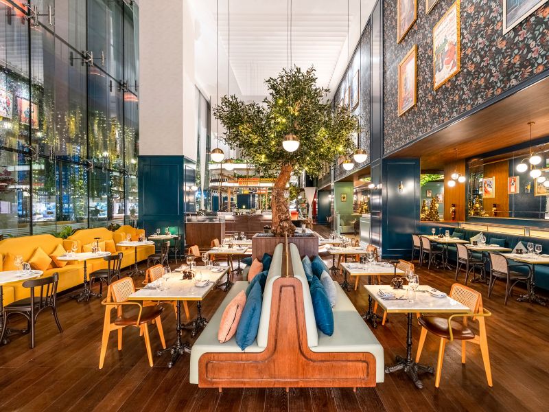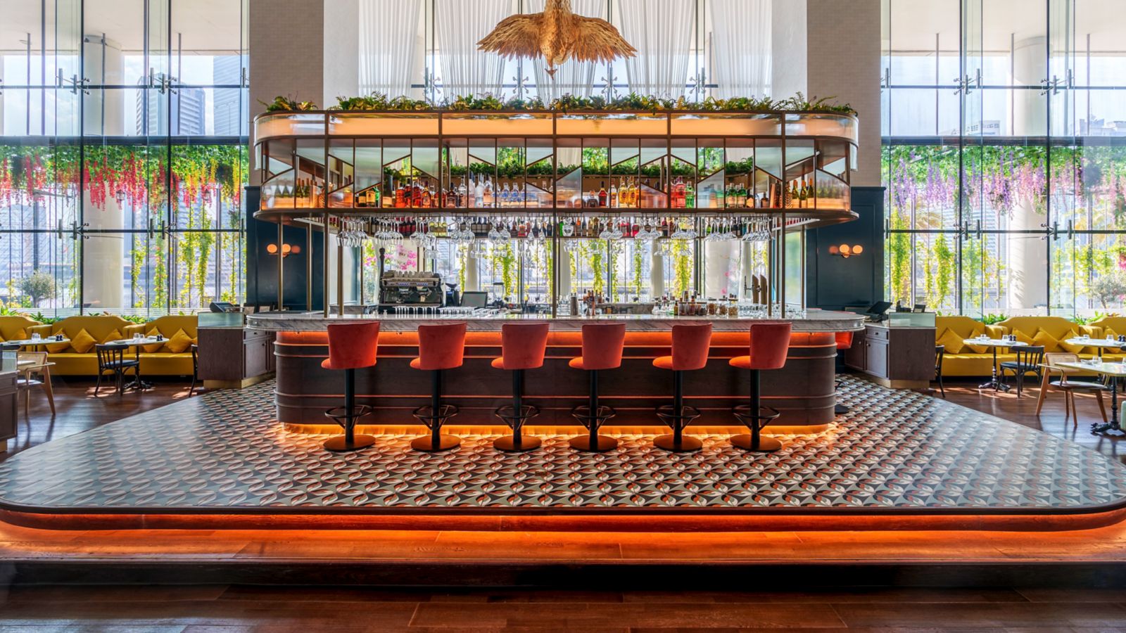 El Couqley French Brasserie es un bistró francés premium e informal de alta cocina que ofrece un servicio cálido y personalizado, con una escultura de un gallo dorado volando sobre la barra central y asientos inspirados en jardines franceses.