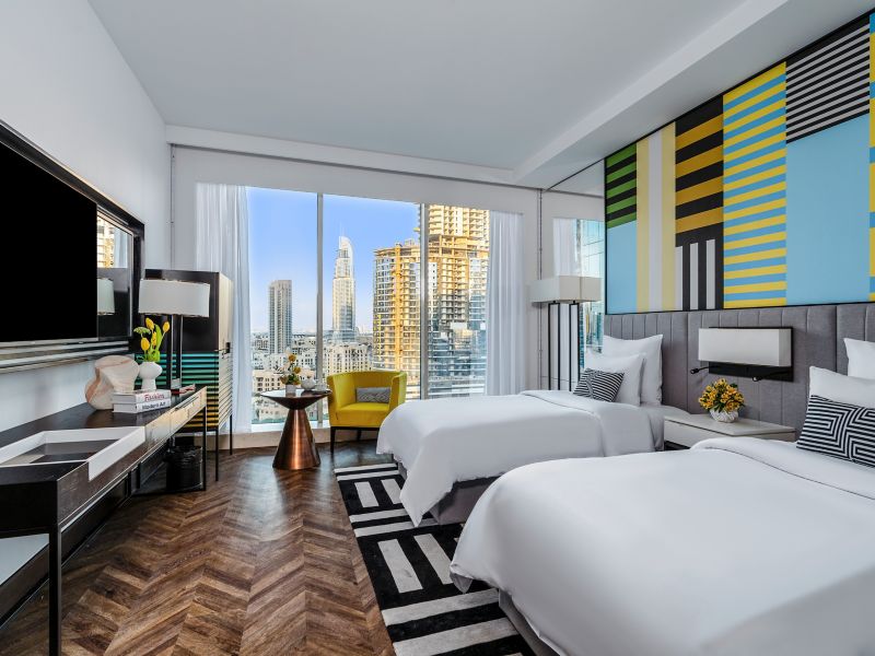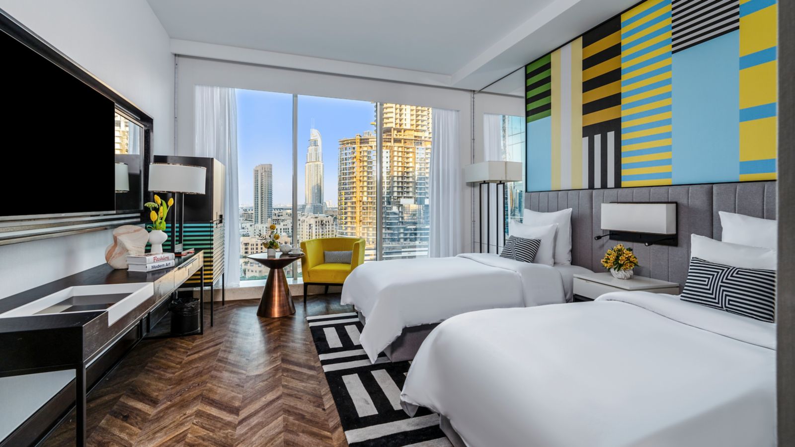 Habitación Executive con dos camas individuales y vistas al Burj Khalifa