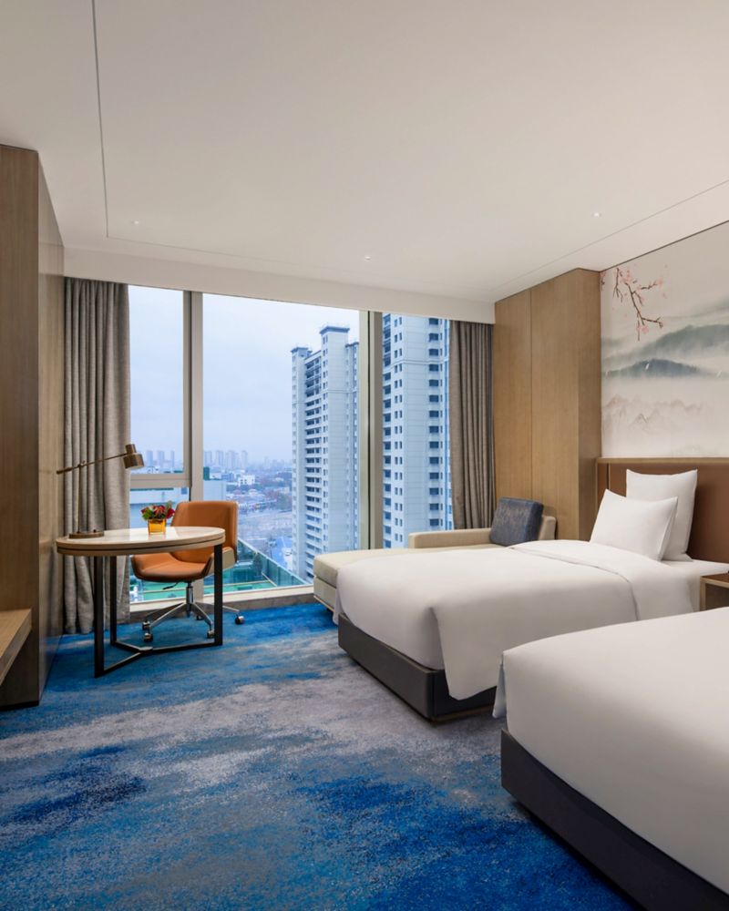 45 m², en las plantas 6 a 22 y con vistas de 180° a la ciudad. TV LED de 55", minibar, caja fuerte, cama Pullman, colchón Kingkoil, sanitarios Duravit, ducha, bañera, ventana inteligente y productos de tocador C. O. Bigelow. Cama supletoria a petición.