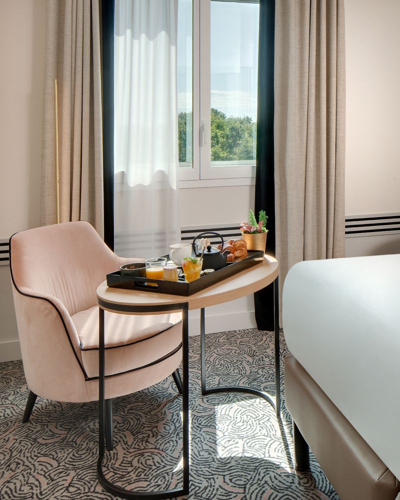 Habitación de 25 m² en planta alta con ducha a ras de suelo o bañera, WIFI gratuito, televisor LCD de 55 pulgadas, cafetera Nespresso y tetera, agua y refrescos gratis, caja fuerte, minibar, servicio VIP nocturno bajo petición y acceso piscina y gimnasio