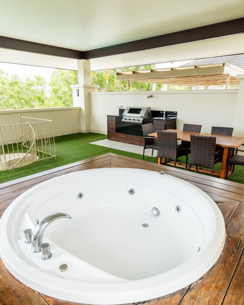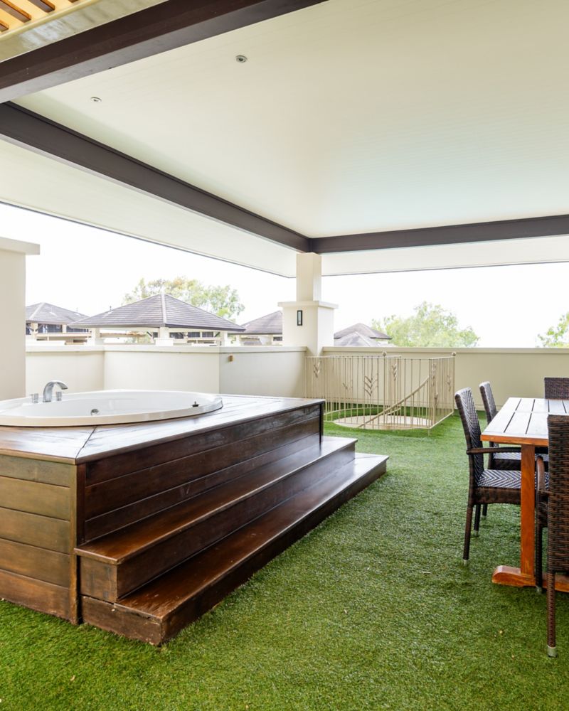 Apartamento de dos dormitorios con acceso a un patio privado con piscina completamente vallada y zona de ocio al aire libre. Las habitaciones están situadas lejos de las zonas principales de la laguna, lo que ofrece un alto nivel de comodidad y privacidad