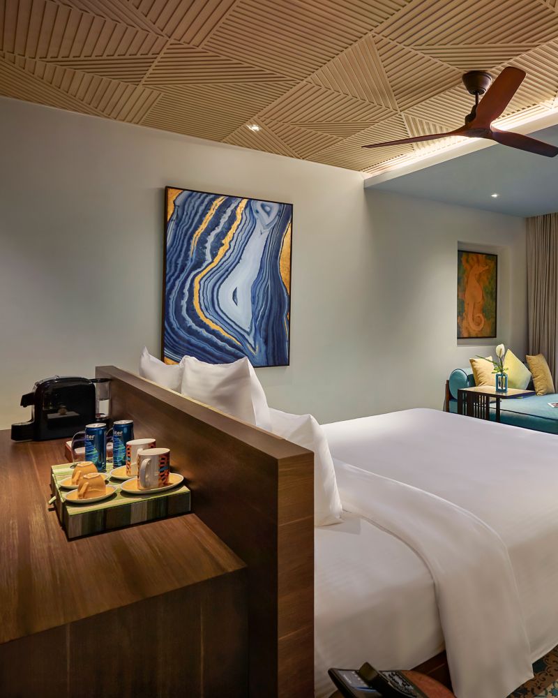 45 m², vistas al jardín, 2 camas unidas (240 × 200 cm) que comparten un gran cabecero, ducha de lluvia, cafetera, IPTV de 55", minibar, WIFI, sistema de luz nocturna y balcón. Máximo 2 adultos y 2 niños en las camas disponibles.
