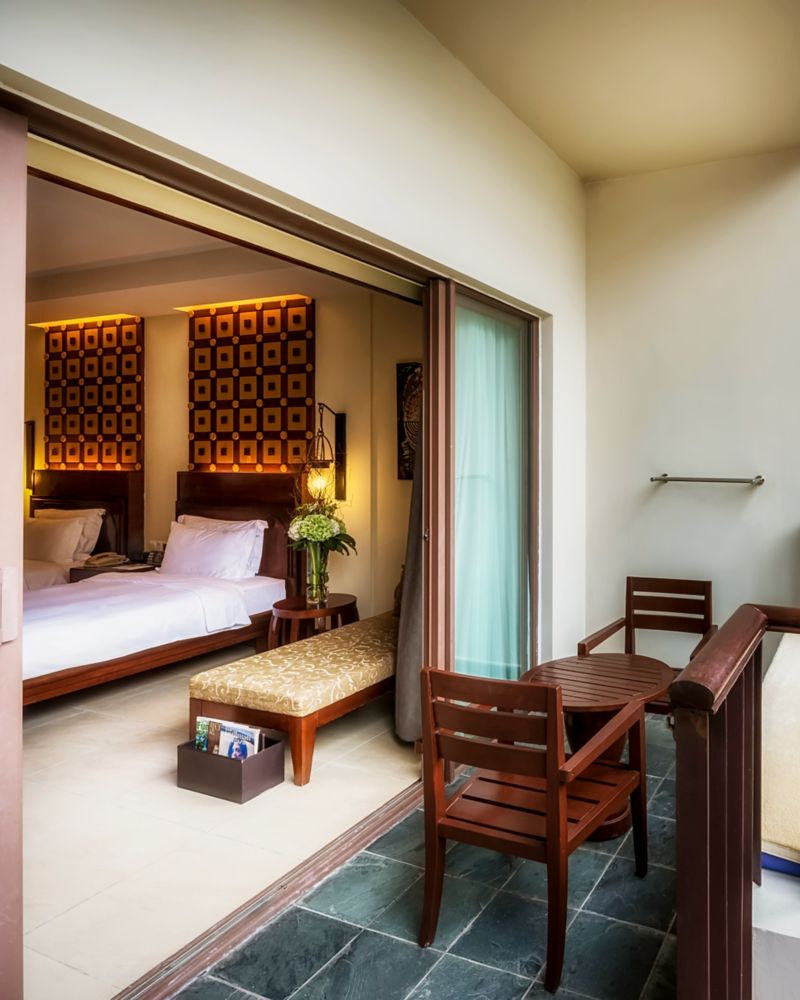 Amplia suite de estilo asiático de 86 m² con 2 dormitorios, bañera y ducha independiente, C.O. Productos de tocador Bigelow, agua mineral gratuita, minibar, TV LED de 42", WIFI, balcón individual y espléndidas vistas a la piscina y al jardín tropical.