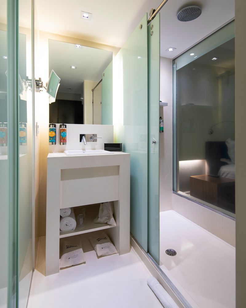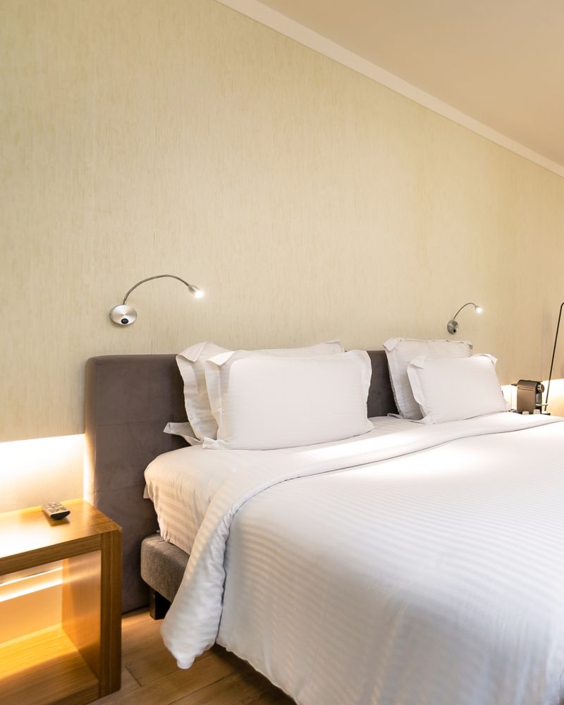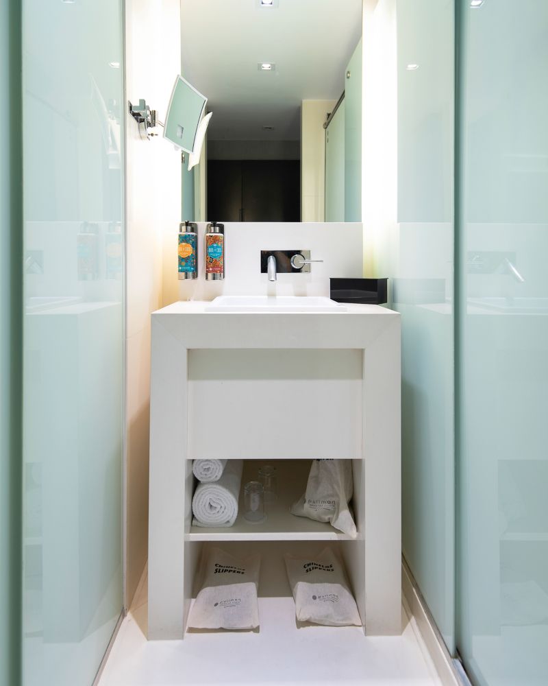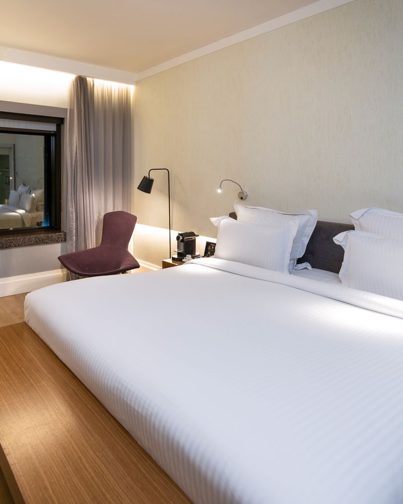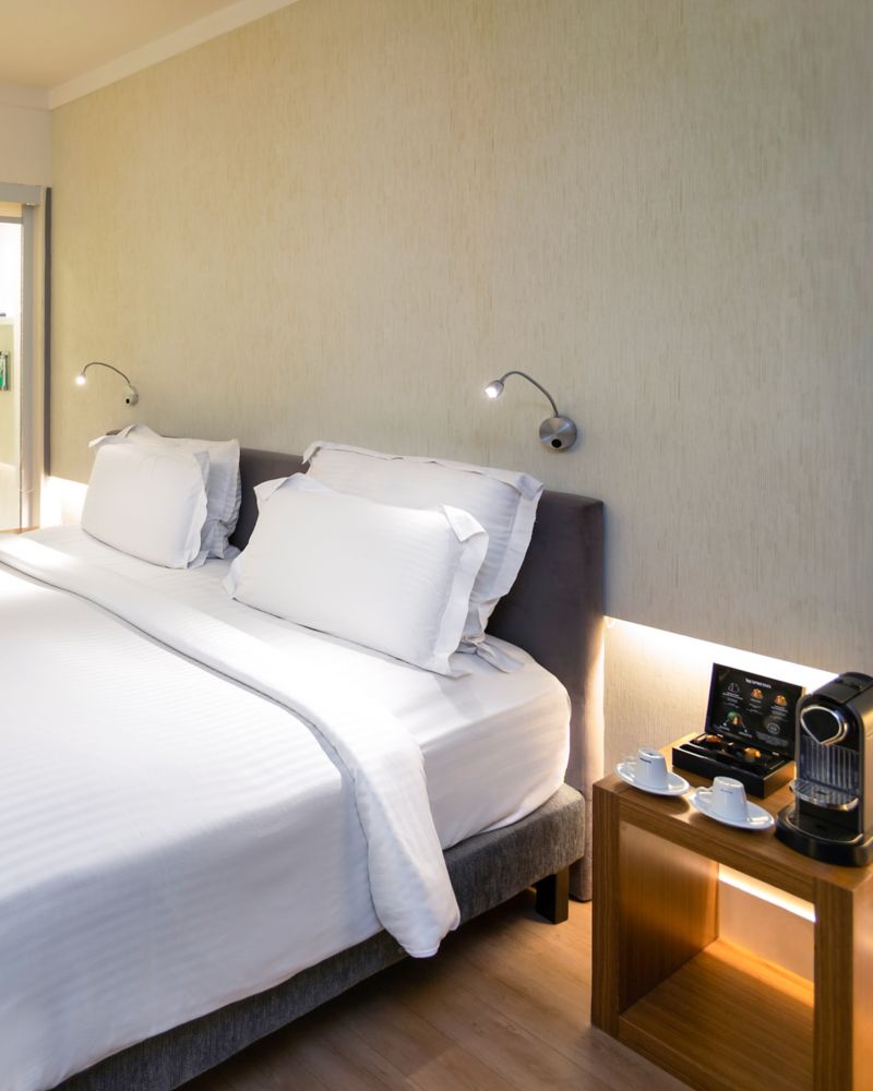 Apartamento de 27 m² con cama queen size, vistas a la ciudad, WIFI gratuito, TV LCD de 49", tetera, cafetera Nespresso con cápsulas gratuitas, zapatillas Pullman y 2 latas de agua gratuitas al día.