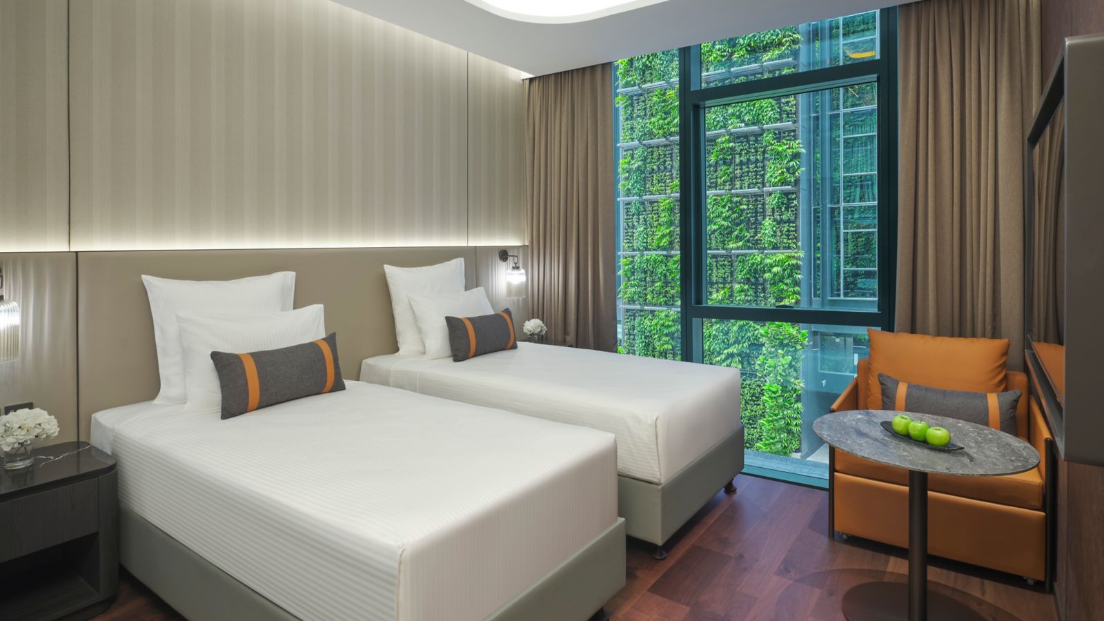 Habitación Deluxe de exquisito diseño con dos camas individuales, ventanales, ducha de lluvia accesible para silla de ruedas, zona de trabajo, cápsulas de café Nespresso o té premium, productos de baño C. O. Bigelow y WIFI gratuito