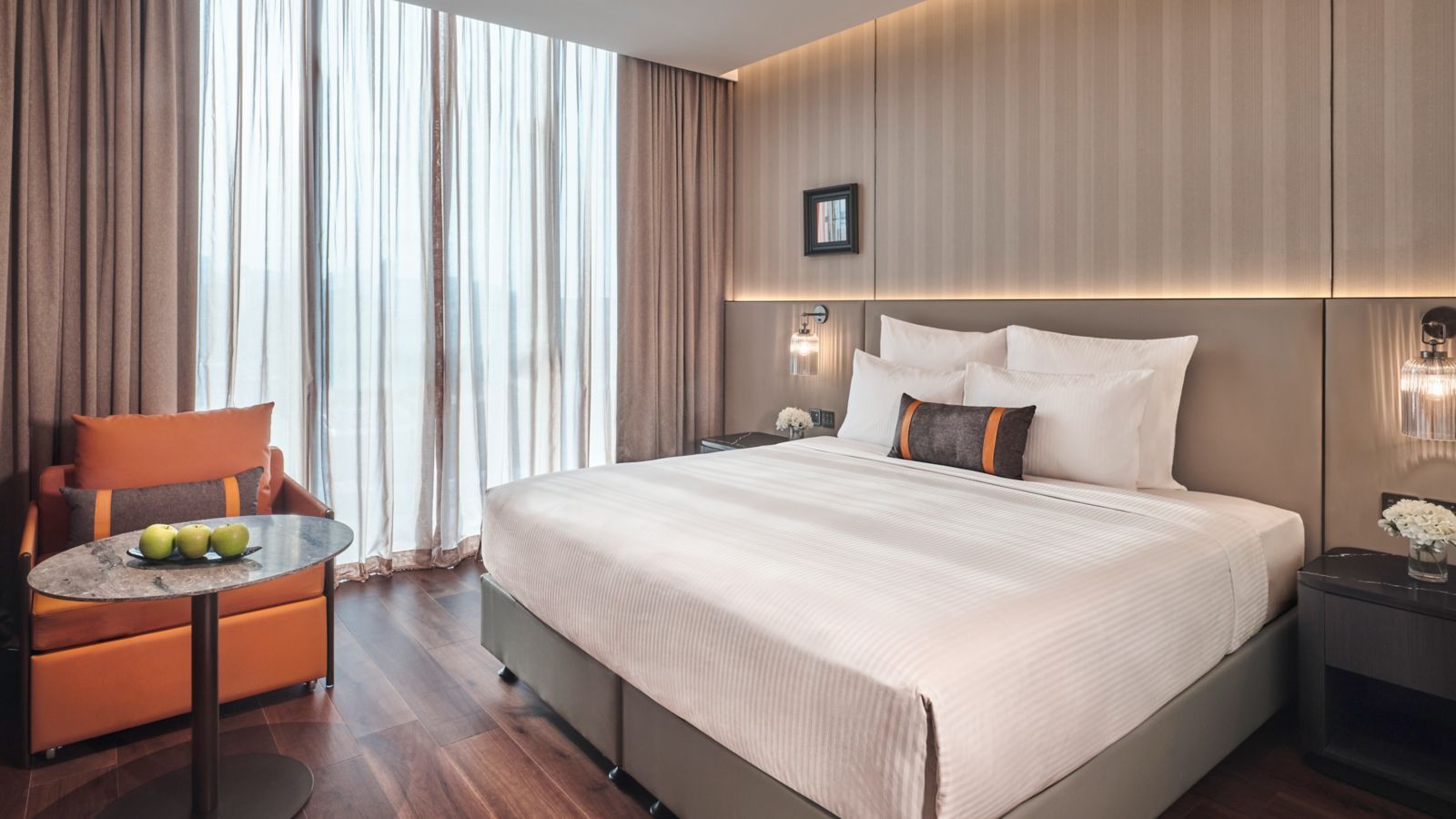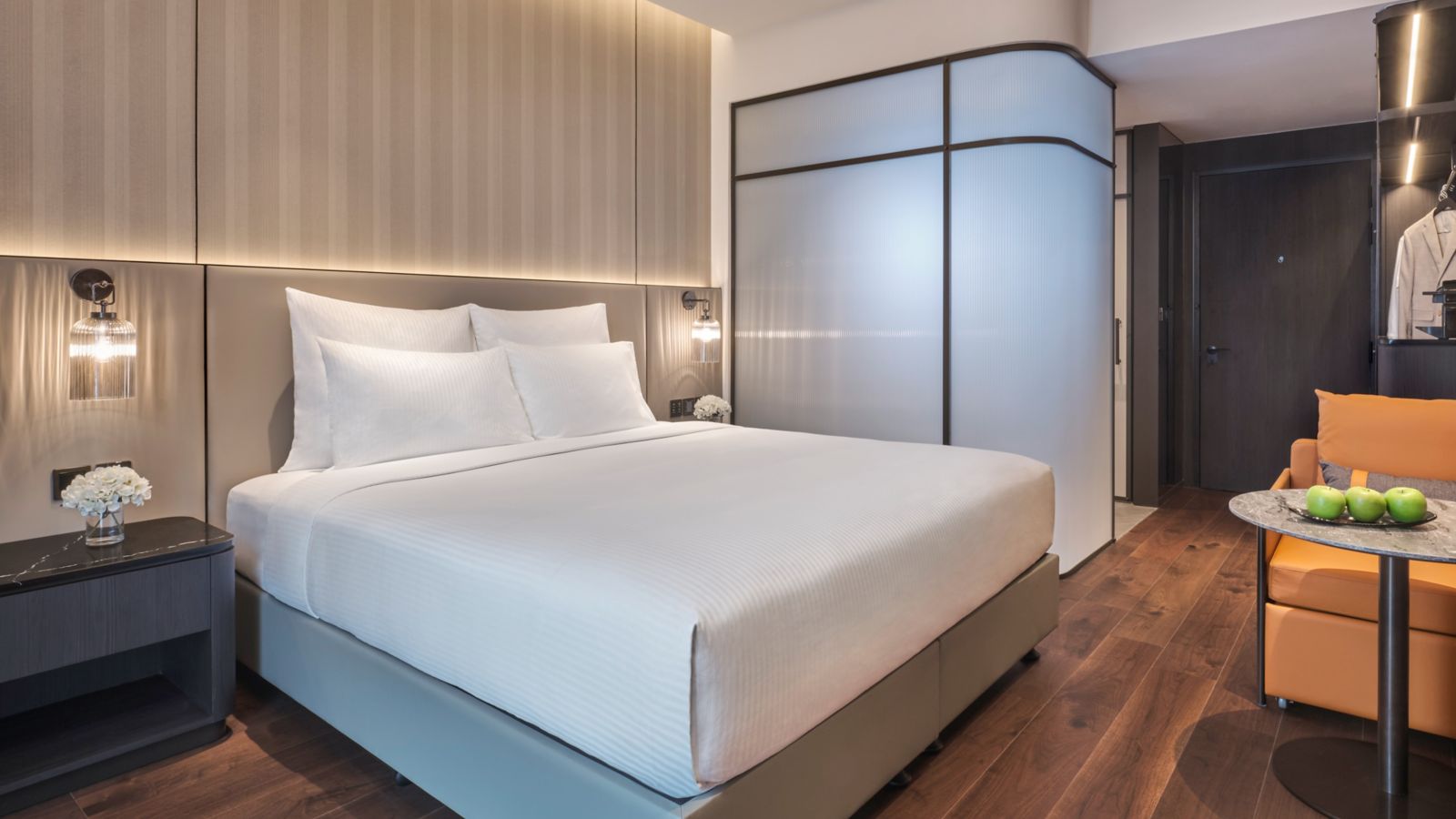 Habitación Deluxe de exquisito diseño con cama king size y sillón cama, ventanales, baño con ducha de lluvia, zona de trabajo, café aromático Nespresso en cápsulas o té premium, productos de baño C. O. Bigelow y WIFI gratuito