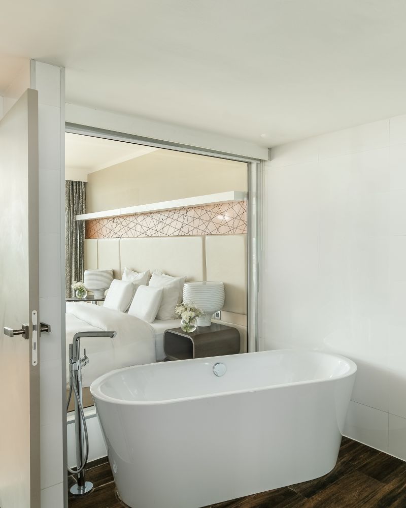 613 pieds carrés (57 m²), contemporain, salon avec canapé-lit, connexion WIFI, télévisions LCD par satellite, coffre, minibar, plateau bouilloire, cafetière Illy, toilettes séparées, sèche-cheveux, climatisation, baignoire et douche.