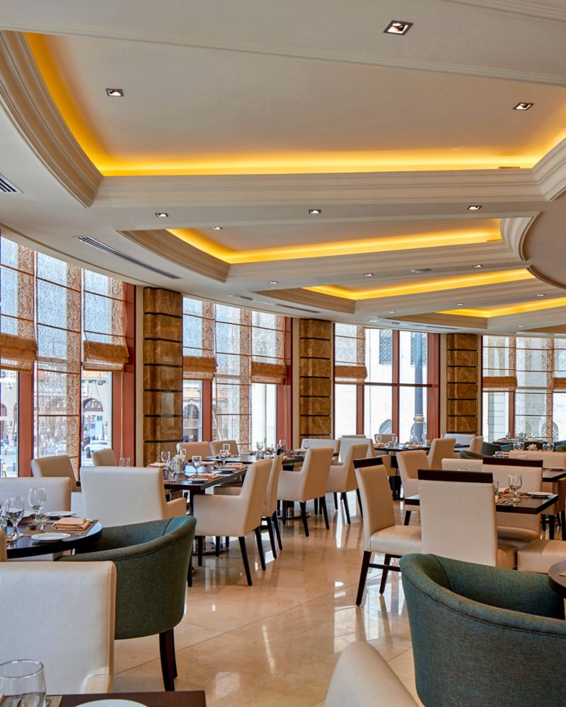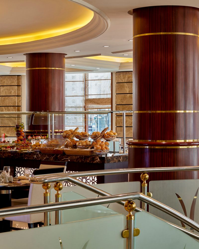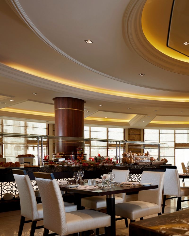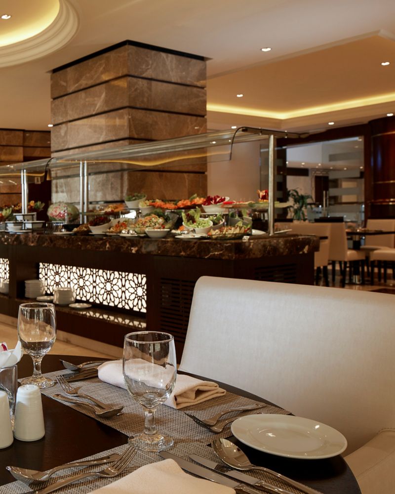Expérience gastronomique internationale sur le toit, buffet en continu, spécialités méditerranéennes et asiatiques à la carte, Les Grands Classiques des Brasseries Françaises, etc., tout en profitant d'une belle vue sur la Mosquée du Prophète (PBSL).