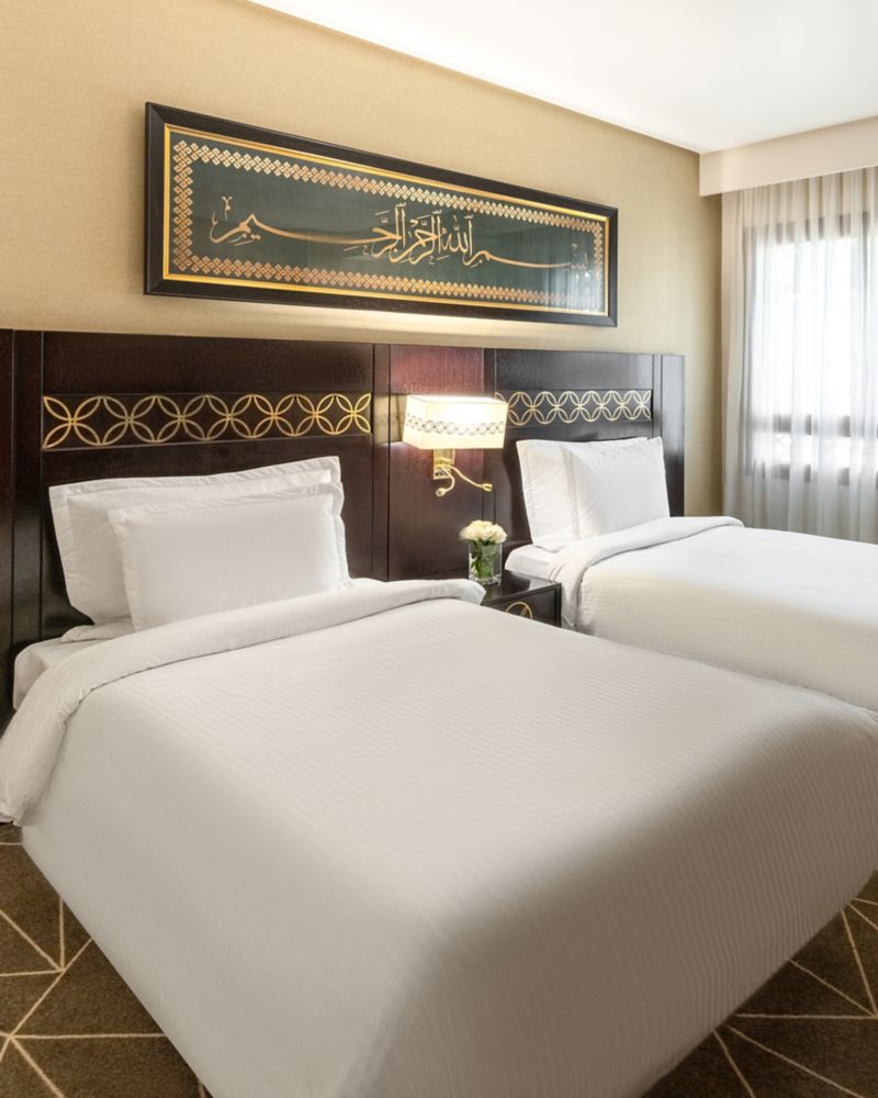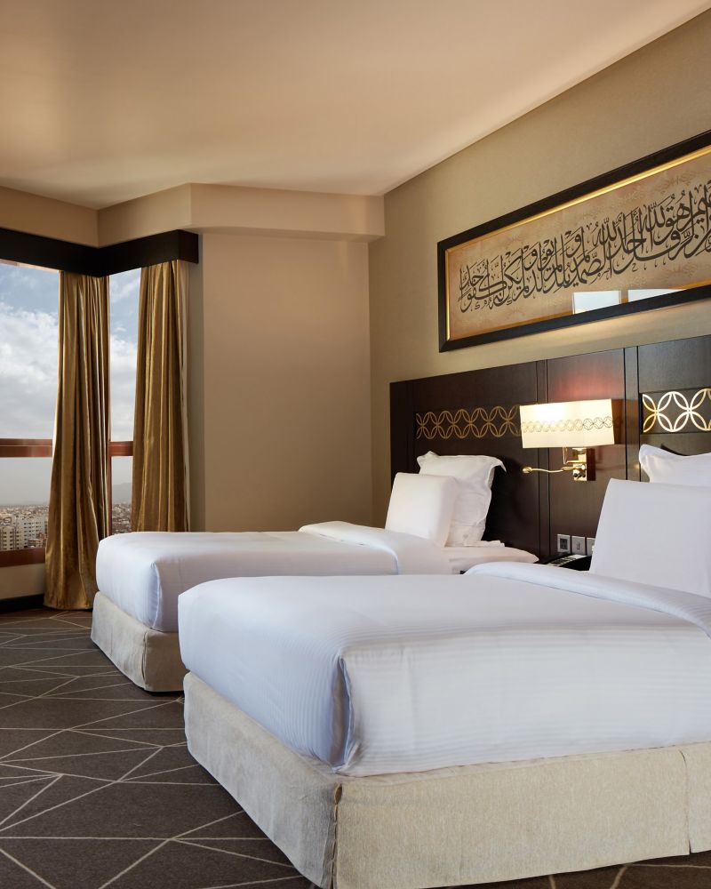 La chambre de 35 m² offre un séjour confortable avec vue sur Médine. La chambre est équipée d'une TV LED 40" pour vous divertir dans le plus grand confort, de l'accès gratuit à Internet, d'un plateau thé/café et d'une salle de bains avec douche
