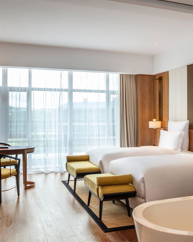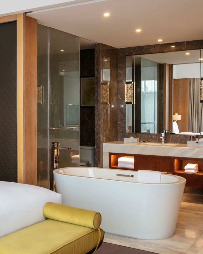 45 SQM/484 SQF, Located on levels 1 to 5, Free WiFi, 50 inch TV, Coffee Maker, Mini Bar, Working Desk, C. O. Bigelow Amenities, Separate Shower and Bathtub, Executive Lounge access, Private Balcony, 1 Extra Bed possible.
