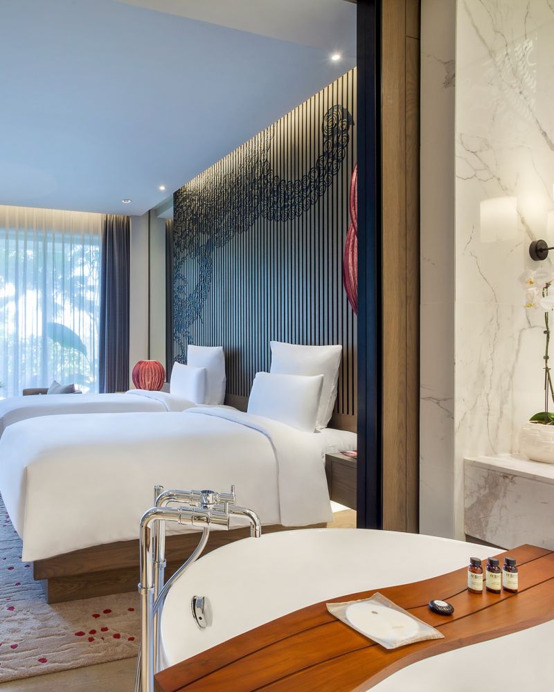 Séjournez dans une chambre Deluxe de 42 m² avec lits simples donnant sur la piscine, les rizières ou les jardins. La chambre dispose de lits jumeaux, d'un grand balcon, d'une Smart TV 55", de WIFI, d'une théière/cafetière et d'une douche à effet pluie.