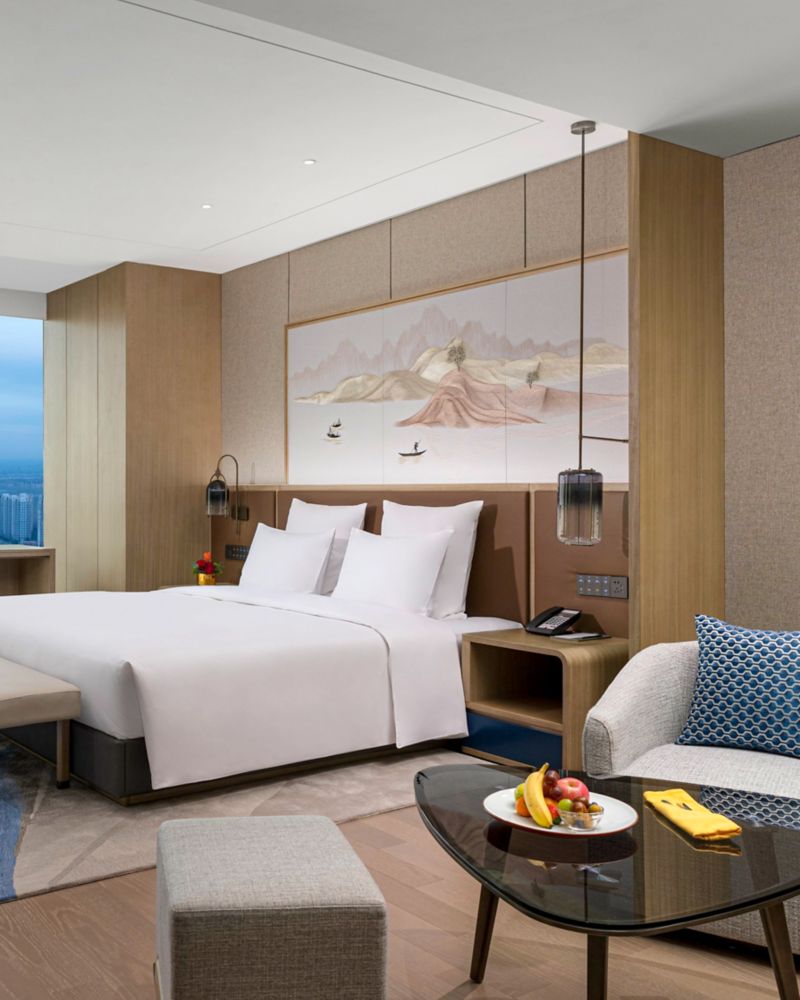 40 SQM,430 SQF,located on 6 to 22 floor.With free internet,55inch LED TV,Mini Bar,Safe.With Pullman bedding, Kingkoil mattress,Duravit sanitary, Rain Shower and Bathtub,intelligent dimming glass, C.O. Bigelow amenities. Extra bed is available on request.