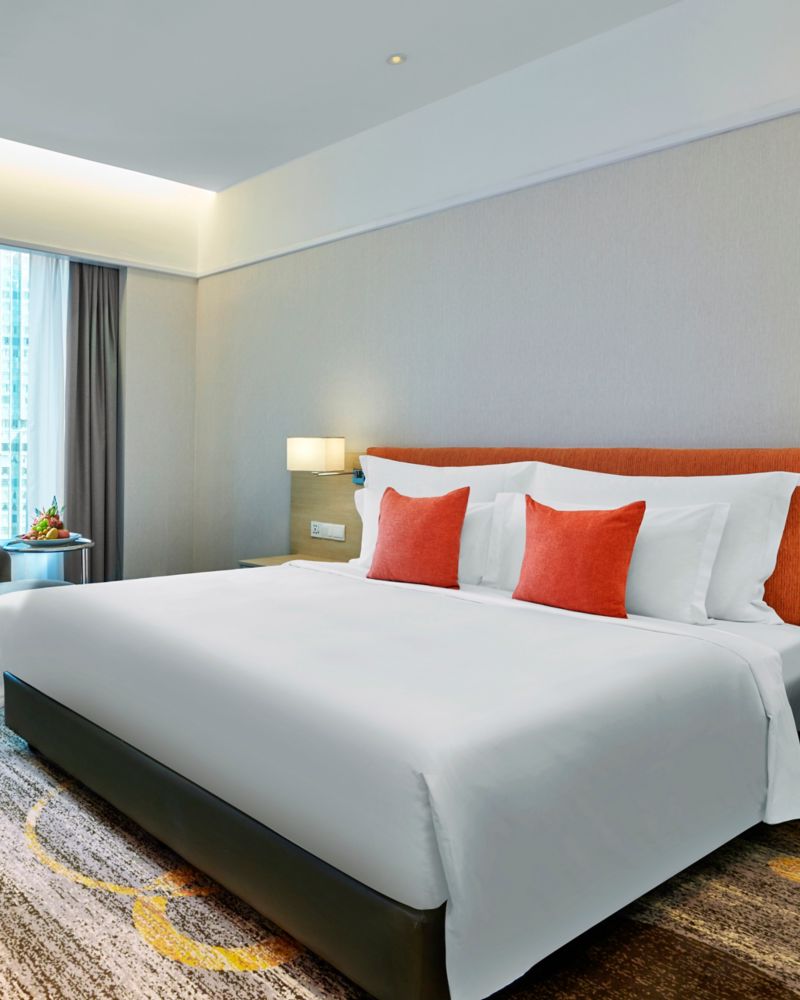 La chambre Deluxe, dotée d'un lit king size, offre une retraite élégante de 35 m² (377 sqft) à un étage supérieur, alliant un design contemporain à des vues vivifiantes sur les toits de Kuala Lumpur. Profitez du Wi-Fi gratuit, d'une télévision LED de 49 pouces et d'un minibar, le tout dans un espace qui allie repos et créativité.