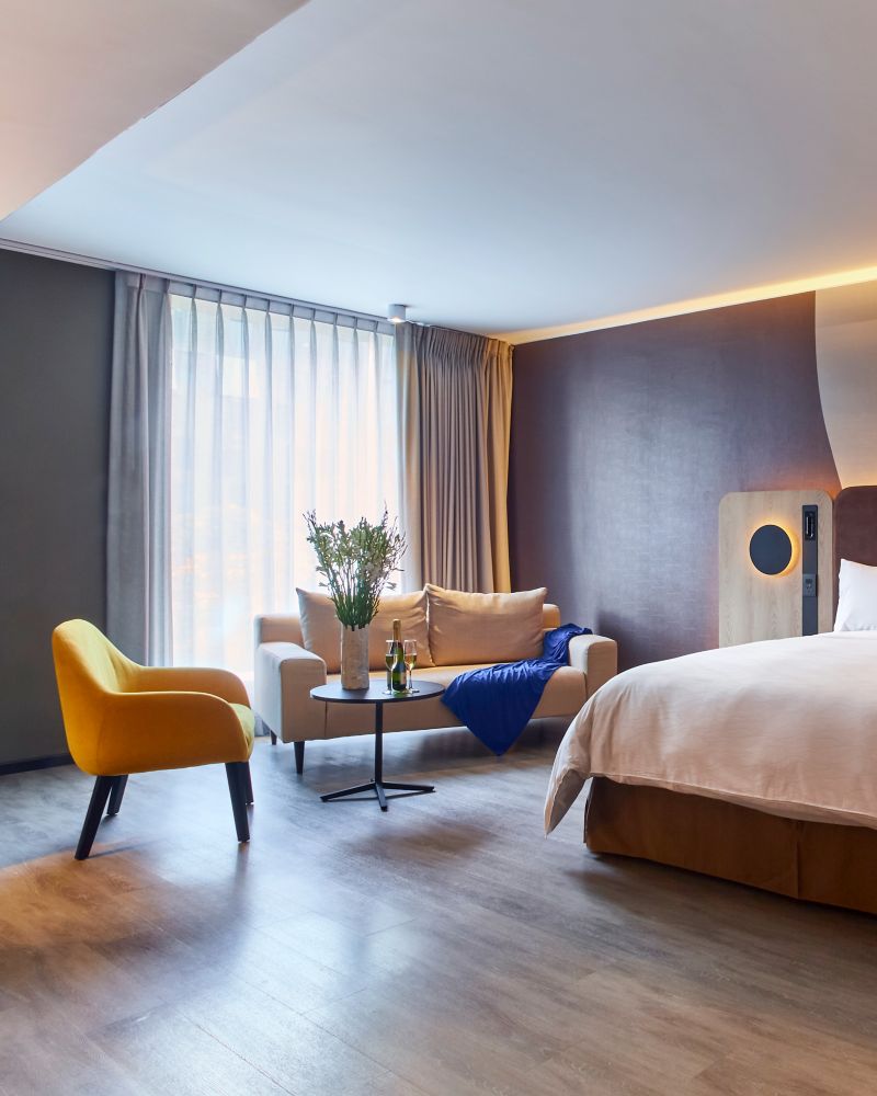 La suite Deluxe, avec son lit king size, offre un espace de 36 m² (387 p²) propice à la détente et à la créativité. Profitez d'une vue vivifiante sur la ville et de technologies intuitives, dans un havre de paix idéal pour la détente et l'inspiration.