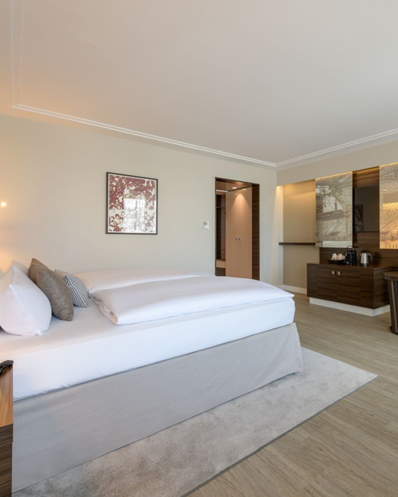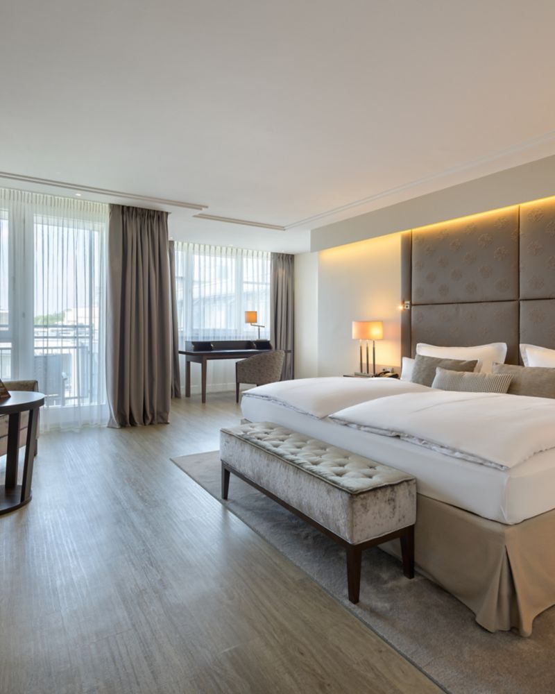 Spacious with a Double Size Bed or 2 Single Size Beds, balcony or loggia, modern design. Equipped with: A/C, free WIFI, LED TV with Sky, tea and coffee-making facilities, iron/ironing board, large desk, telephone, safe, rain shower or bathtub, hairdryer.