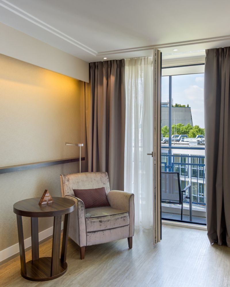 Spacious and bright, 269-301 sq. ft (25-28 sqm), balcony or loggia, modern design. Equipped with: A/C, free WIFI, LED TV with Sky, free tea and coffee-making facilities, iron/ironing board, large desk, telephone, safe, rain shower or bathtub, hairdryer.
