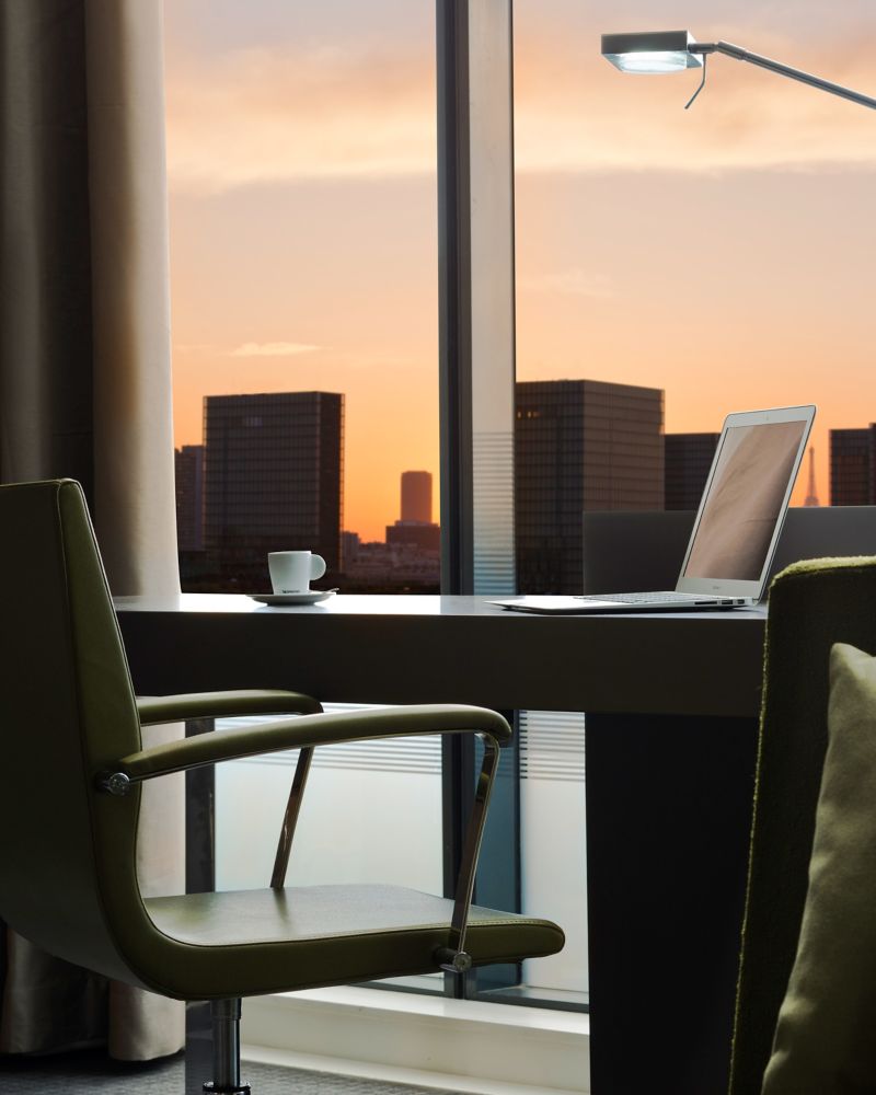La suite Duplex, située en étage élevé, offre une vue imprenable sur Paris. D'une superficie de 55 m², cette suite est un véritable havre doté d'aménagements bien pensés et de technologies intuitives, parfait pour ceux qui apprécient une pause inspirante au cœur du rythme dynamique de la ville.