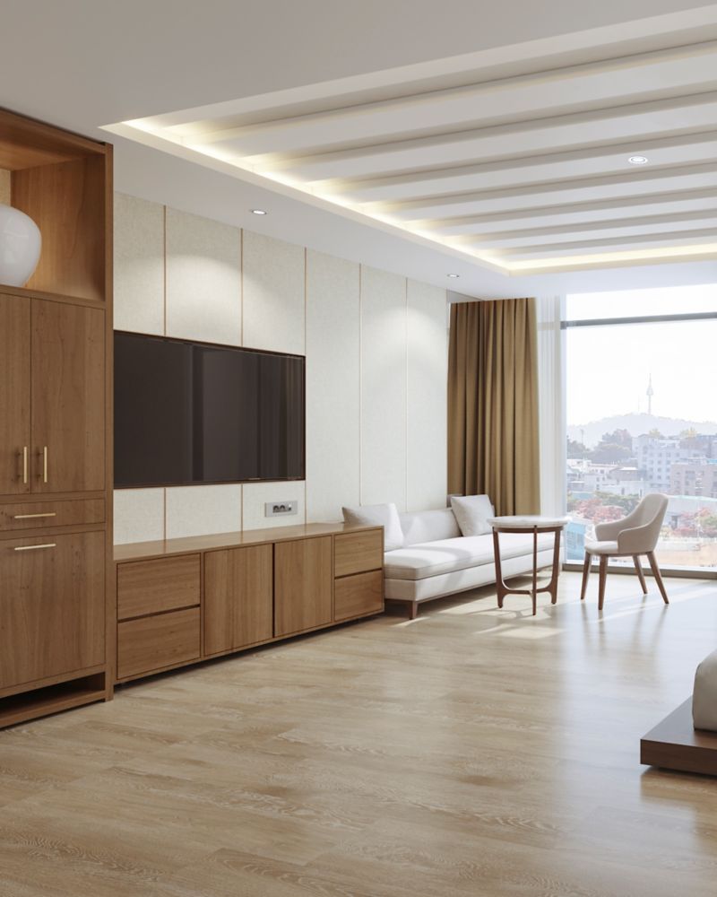 Namsan King - 40 m², lit king size. Décor luxueux et moderne avec mobilier en bois et vue imprenable sur le Namsan. Smart TV 65", service IoT, minibar, machine à café, chargeur sans fil, haut-parleur Bluetooth, baignoire et douche à effet pluie.