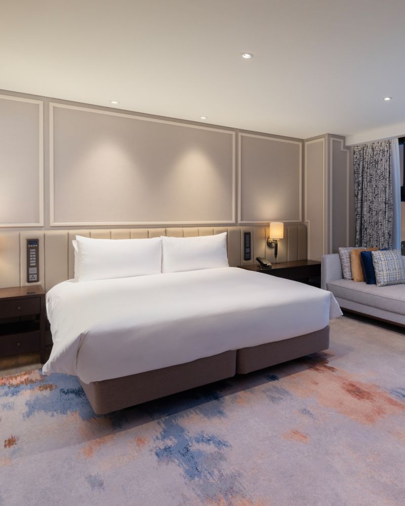 Chambre Supérieure de 27 m² avec lit King Size, décor moderne et luxueux renforcé par le mobilier en bois et la vue imprenable sur Séoul. Smart TV 65', WIFI, minibar, cafetière Nespresso, sdb avec douche à effet pluie et articles de toilette Co Bigelow.