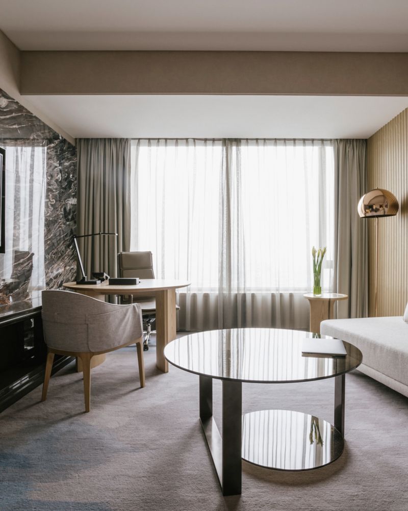La suite Deluxe, avec accès au lounge et lit King size, offre une vue panoramique sur la ville, alliant repos et créativité. Profitez de 50 m² (538 sqft) d'un espace pensé dans les moindres détails.