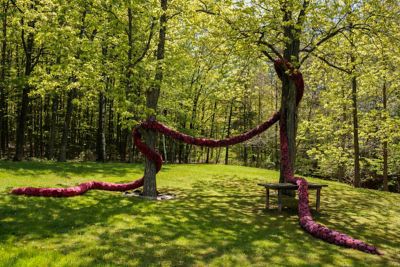 C’est mon attrait pour cette tension qui m’a attiré vers l’œuvre fascinante de Sagarika Sundaram. Cette sculptrice et artiste née en Inde, et vivant à New York, utilise une technique ancestrale de feutrage qui consiste à teindre à la main de la laine brute et à la diffuser avec de l’eau savonneuse pour créer des structures complexes et texturées qui s’élèvent du sol, pendent du plafond, s’enroulent autour des arbres ou remplissent les crevasses entre les rochers. Elle est fascinée par l’indissociabilité des êtres humains et de la nature, ainsi que par la tension entre l’intérieur et l’extérieur. « La nature est profondément ancrée dans ma psychologie », me dit-elle. « J’aime ouvrir les choses : les géodes, les cristaux, les fleurs. « Je suis intriguée par les mystères qu’elles renferment », dit-elle.