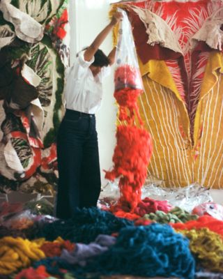 Nous discutons sur Zoom, par un après-midi ensoleillé d’automne. Je suis à Toronto, et elle, dans l’un de ses trois studios à Manhattan. En parlant de son travail, elle est impatiente de me montrer les photos de ses dernières expositions et s’arrête sur une fresque murale colorée composée de tissu, de laine brute et de fils qui pendent. Proche du centre se trouve une forme ovale, prise dans un réseau de fils nervuré. « Je suis attirée par les formes abstraites qui peuvent être interprétées de plusieurs façons : il peut s’agir d’une fleur carnivore ou bien d’un globe oculaire », dit-elle en souriant. « Mon travail explore notre relation avec ce qui est indomptable. Je pense que cela reflète un aspect de la nature qui est féroce, séduisant, et qui, d’une certaine manière, reflète la nature humaine.