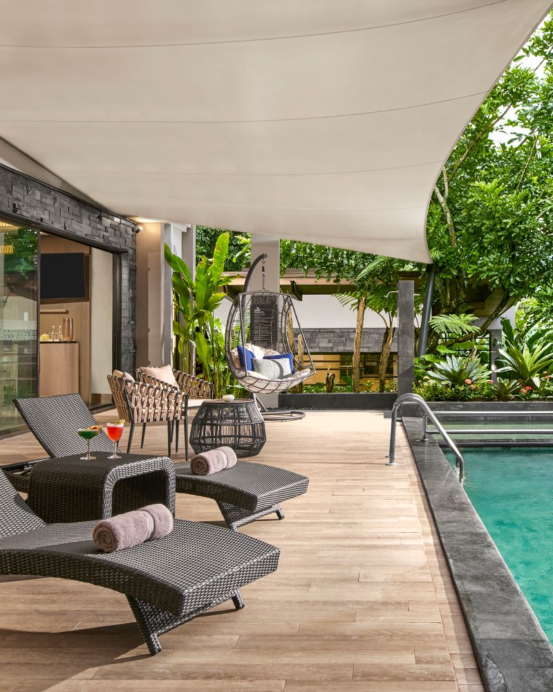 Enjoy a 42 m² room in our 5-star hotel with mountain, pool, rice field or garden view. Equipped with twin beds, large balcony, 49" LED TV, WiFi, coffee & tea making facilities, minibar and rain shower.