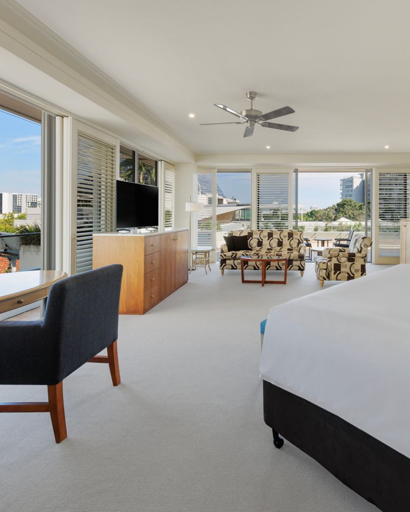 Appointed for comfort in warm, natural hues and all the modern conveniences you need. Our Superior king rooms are spaciously appointed with king bed, single spa bath and private garden balcony overlooking Cairns city.
