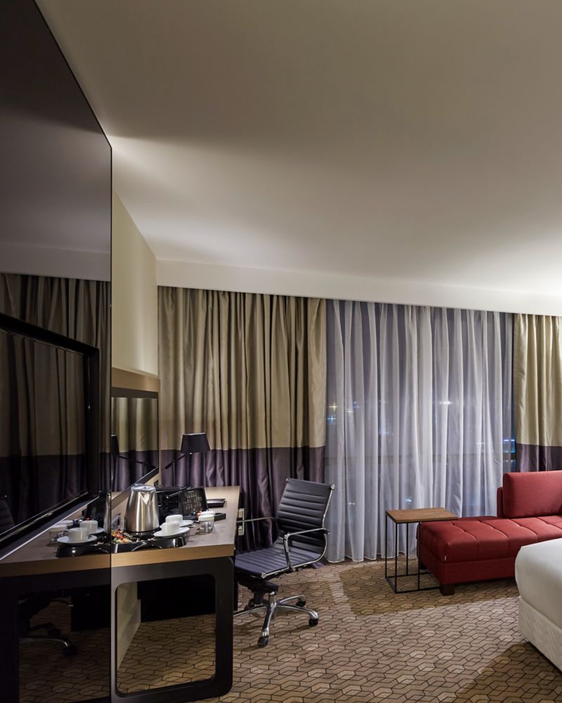 45 M² / 484 SQF Room, free WIFI internet access, spacious working desk, 40 inch LCD TV, mini bar, shower or bathtube, laptop-size safe, access to executive lounge. Non-smoking rooms available upon request