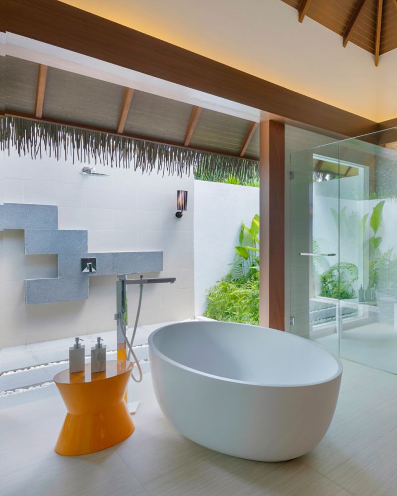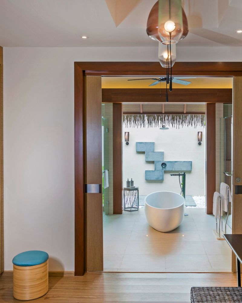 The 160 sqm Ocean Villa sits over the water, offering views of marine life. It includes a sala, 42" TV, WiFi, daily once replenished minibar, sunbeds, and a 6-fixture bathroom with island tub, dual vanities, shower cubicle, and open showers.