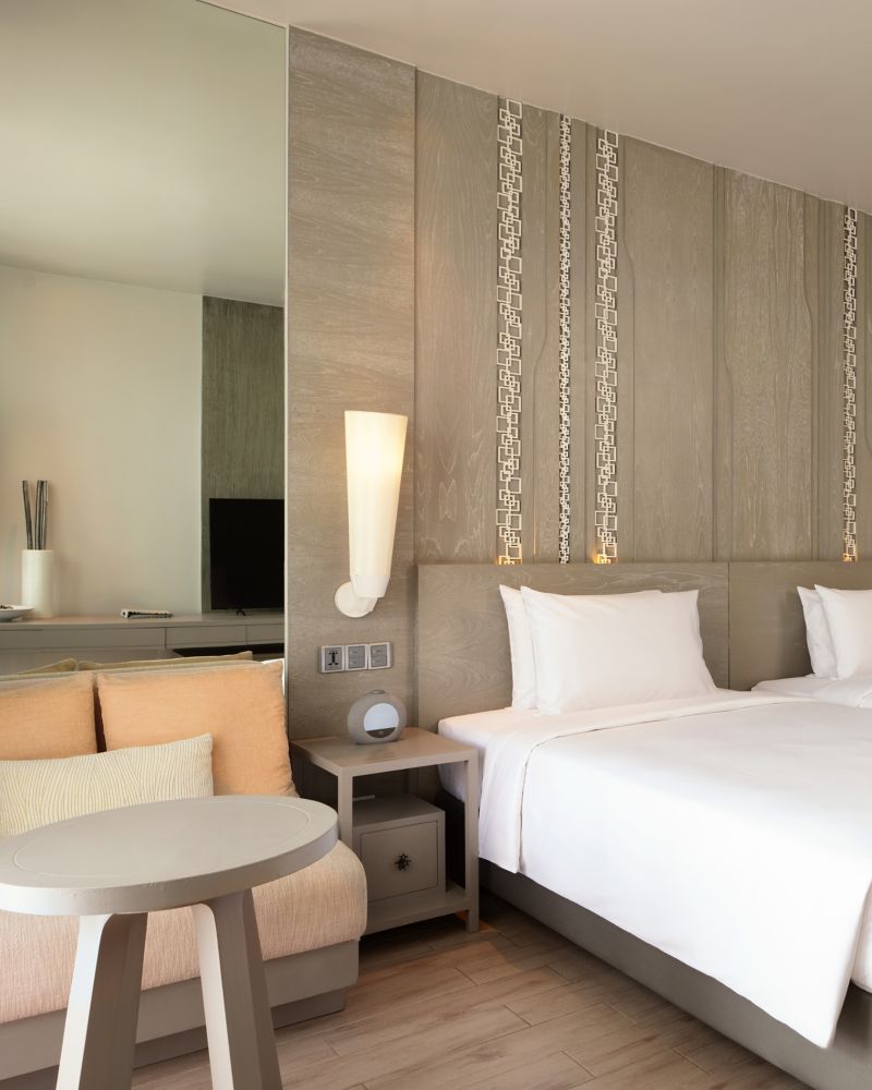 A spacious Grand Deluxe room with 55m² of indulgence to relax and enjoy, including balcony, Wi-Fi, LED TV, espresso machine, minibar, JBL speaker, bathroom with separate bathtub and rainshower. King or Twin beds. Up to 3 adults using existing bedding.