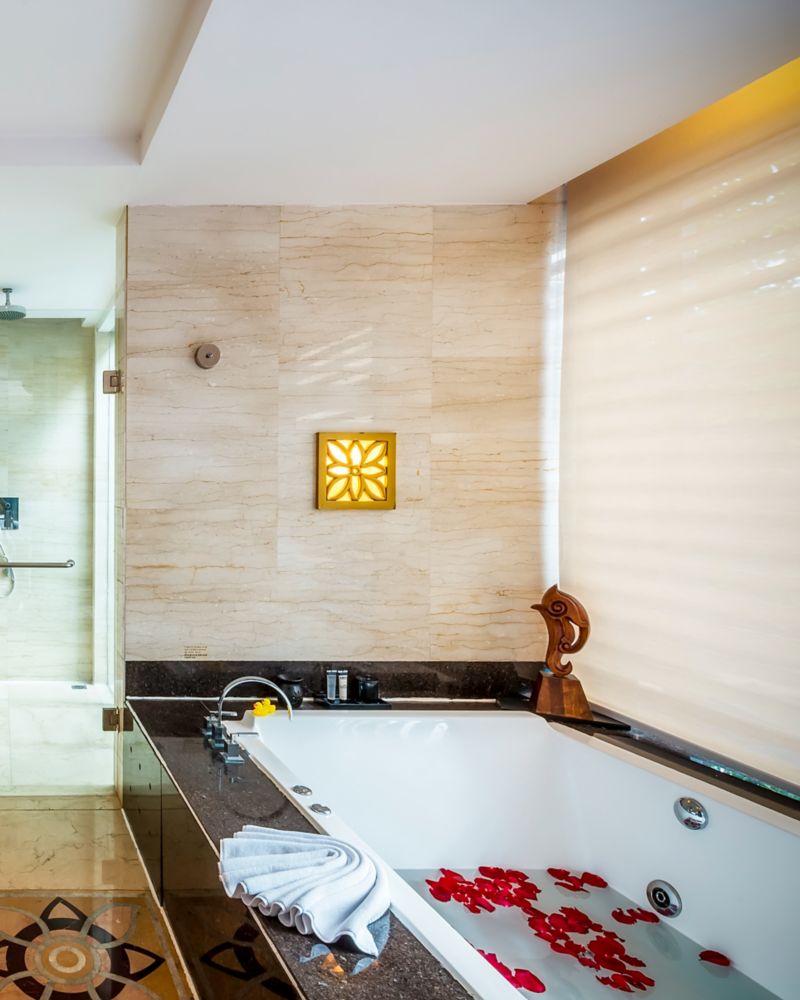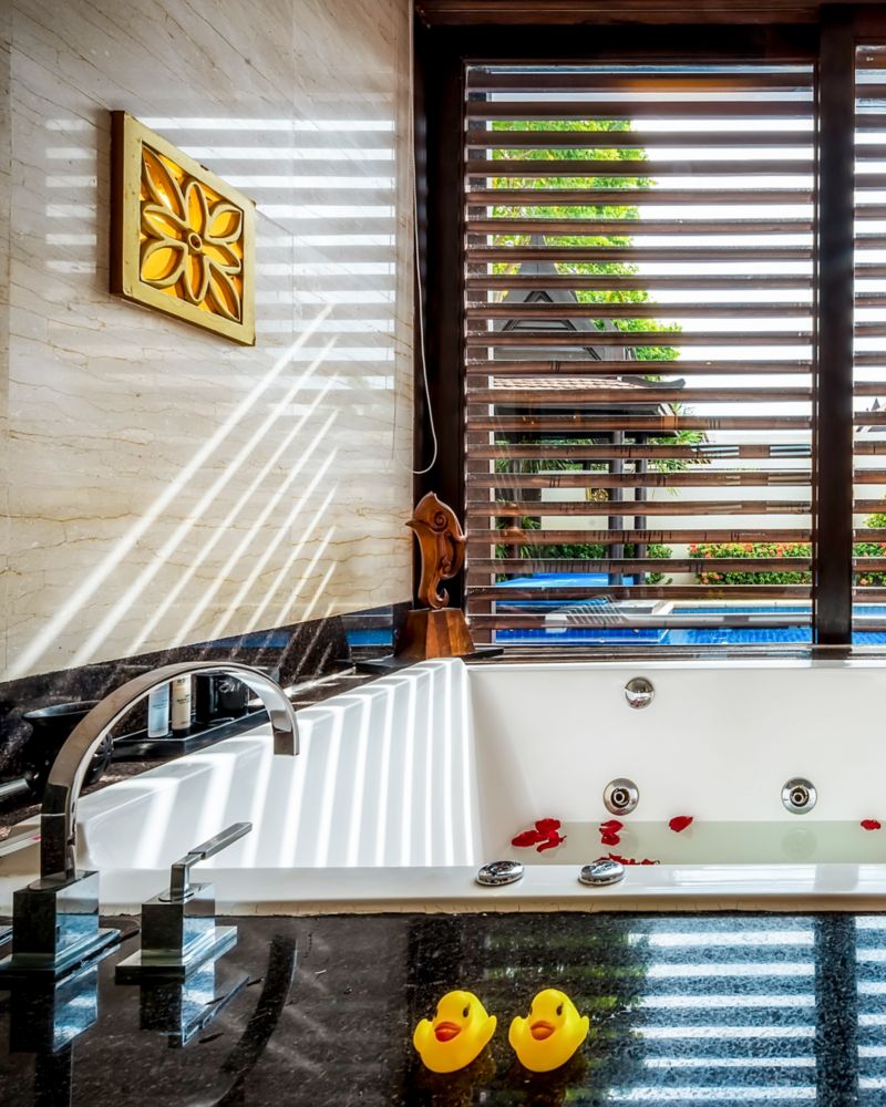 Spacious up to 48sqm with a strong touch of Asian style, offering flat screen TV, bath tub, separate shower room, views of swimming pool. The South East Asian style sculptures and a tropic garden is just outside of the room.