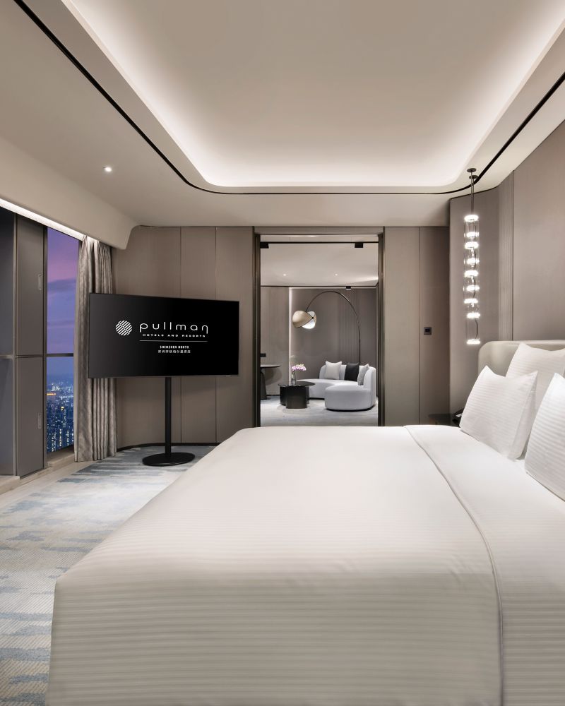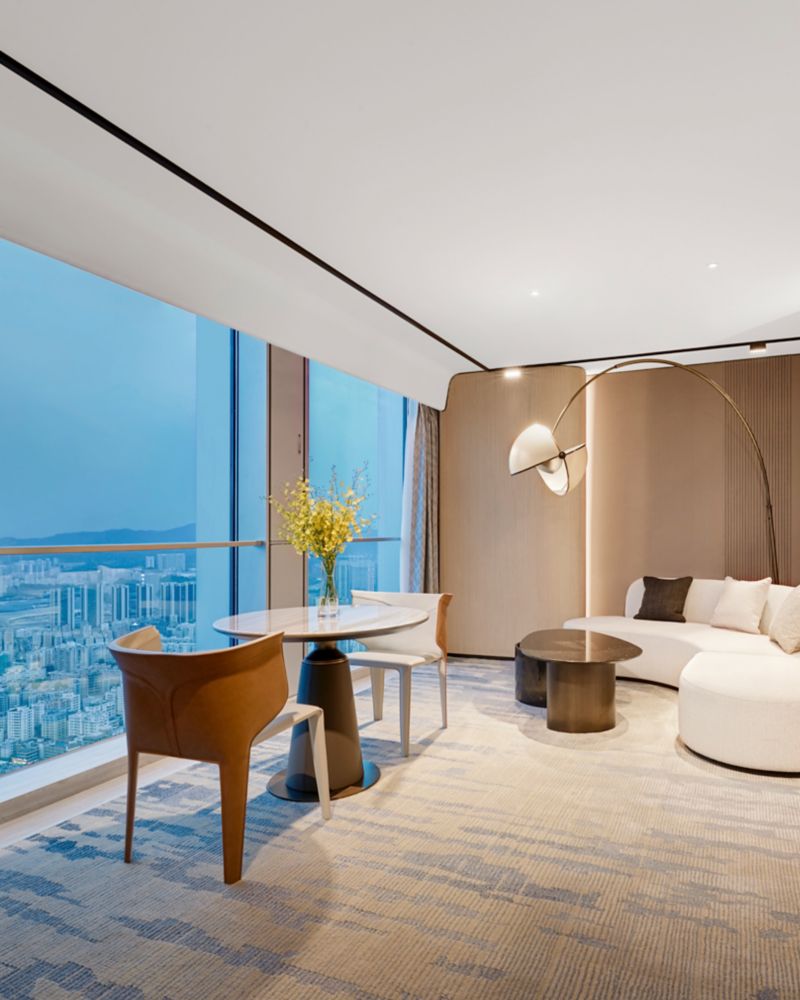 46 m²/495 sq. ft. room, Located on 47th to 55th Floors. Panoramic French windows with Skyline view. Large bathroom with separate shower & bathtub. Luxurious mattress & amenities, 55'' TV, High speed Internet, wireless charger.