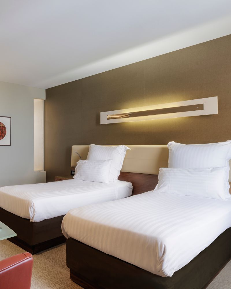 ห้องดีลักซ์พร้อมเตียงเดี่ยวสองเตียง มอบการผสมผสานที่ลงตัวระหว่างการพักผ่อนและความคิดสร้างสรรค์บนพื้นที่ 34 ตร.ม. (366 ตร.ฟุต) ดื่มด่ำกับวิวเมืองหรือสนามกีฬาจากมุมสูง พร้อมสิ่งอำนวยความสะดวกที่ทันสมัย เช่น เครื่องชงกาแฟ Nespresso และสมาร์ททีวี ที่ออกแบบมาเพื่อเติมเต็มความคิดสร้างสรรค์และการพักผ่อนของคุณ